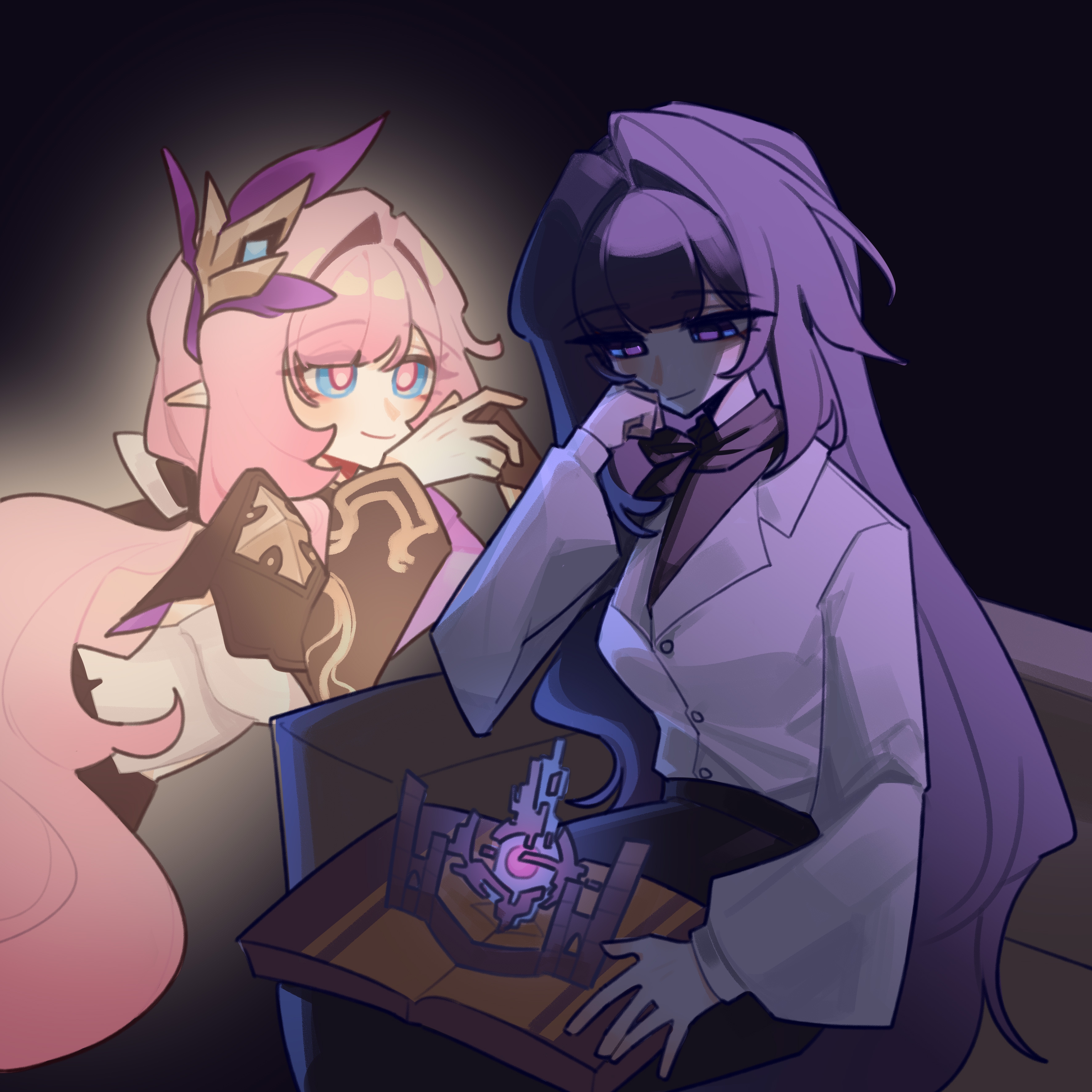 2girls absurdres black_skirt blue_eyes book book_on_lap breasts chinese_commentary commentary_request couch dreaming-of-flying-free elf elysia_(honkai_impact) elysia_(miss_pink_elf)_(honkai_impact) hair_ornament highres honkai_(series) honkai_impact_3rd long_hair medium_breasts multiple_girls on_couch open_book pink_hair pointy_ears purple_eyes purple_hair raiden_mei shirt sitting skirt smile very_long_hair white_shirt