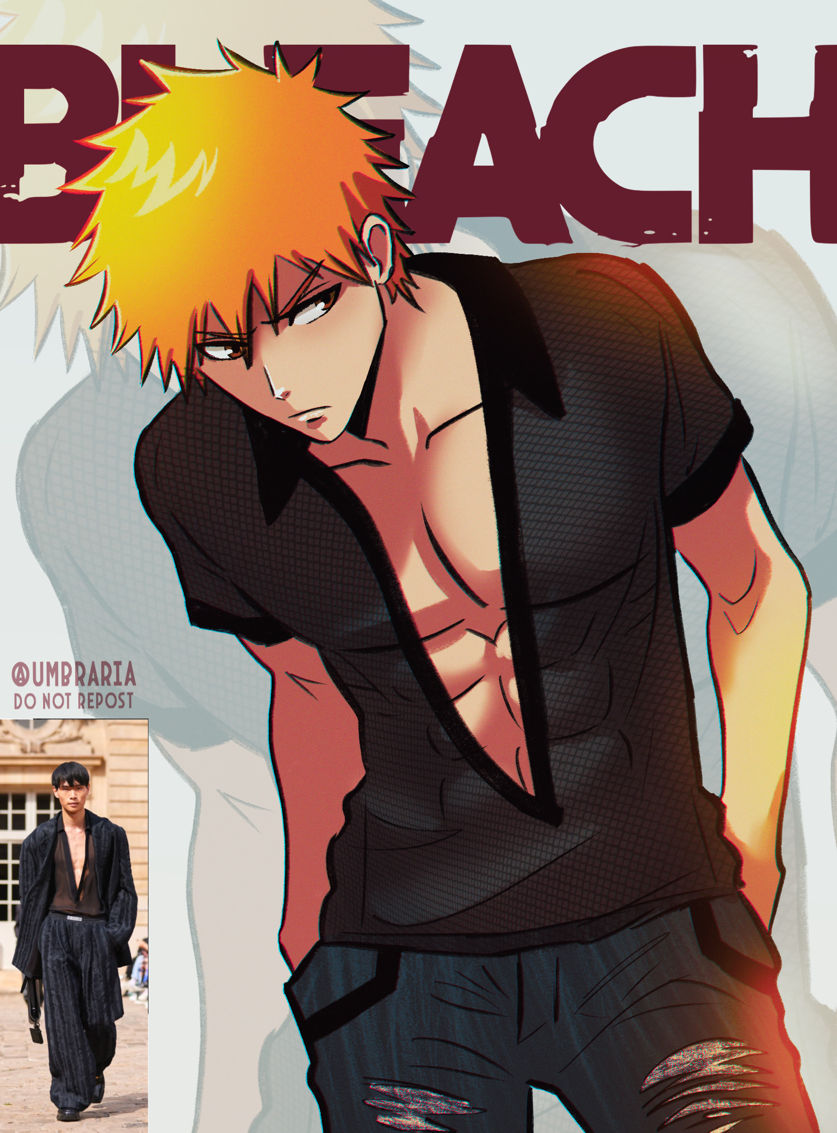 1boy abs bleach brown_eyes commentary copyright_name cowboy_shot english_commentary frown hands_in_pockets highres hunched_over kurosaki_ichigo male_focus orange_hair pants pectorals plunging_neckline reference_inset see-through_clothes see-through_shirt serious shirt solo torn_clothes torn_pants tumblr_username umbra_(edits_umbra) watermark zoom_layer