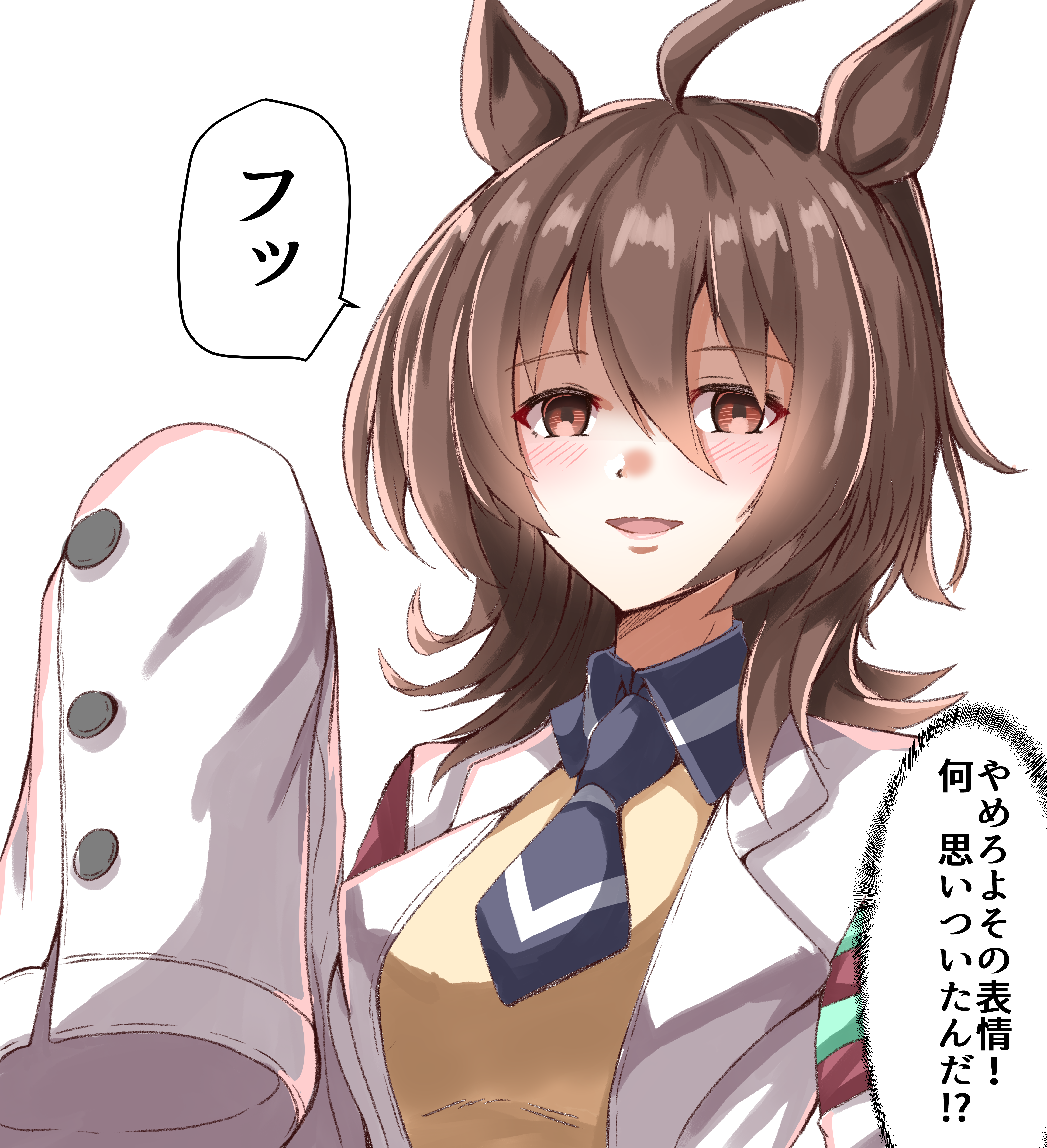 1girl absurdres agnes_tachyon_(tach-nology)_(umamusume) agnes_tachyon_(umamusume) ahoge animal_ears black_necktie blush brown_hair coat commentary_request hair_between_eyes highres horse_ears horse_girl kentan_(kingtaiki) lab_coat long_sleeves medium_hair necktie open_mouth red_eyes shirt short_necktie simple_background sleeves_past_fingers sleeves_past_wrists smile solo speech_bubble sweater sweater_vest umamusume upper_body white_coat wolf_cut yellow_sweater yellow_sweater_vest