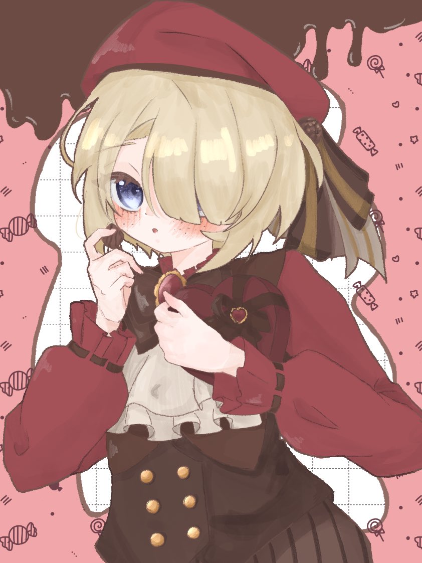 1boy alternate_costume ascot beret blonde_hair blue_eyes blush brooch chocolate cowboy_shot freckles fremi_nett freminet_(genshin_impact) frills genshin_impact hair_over_one_eye hand_up hat jewelry open_mouth red_hat short_hair solo white_ascot