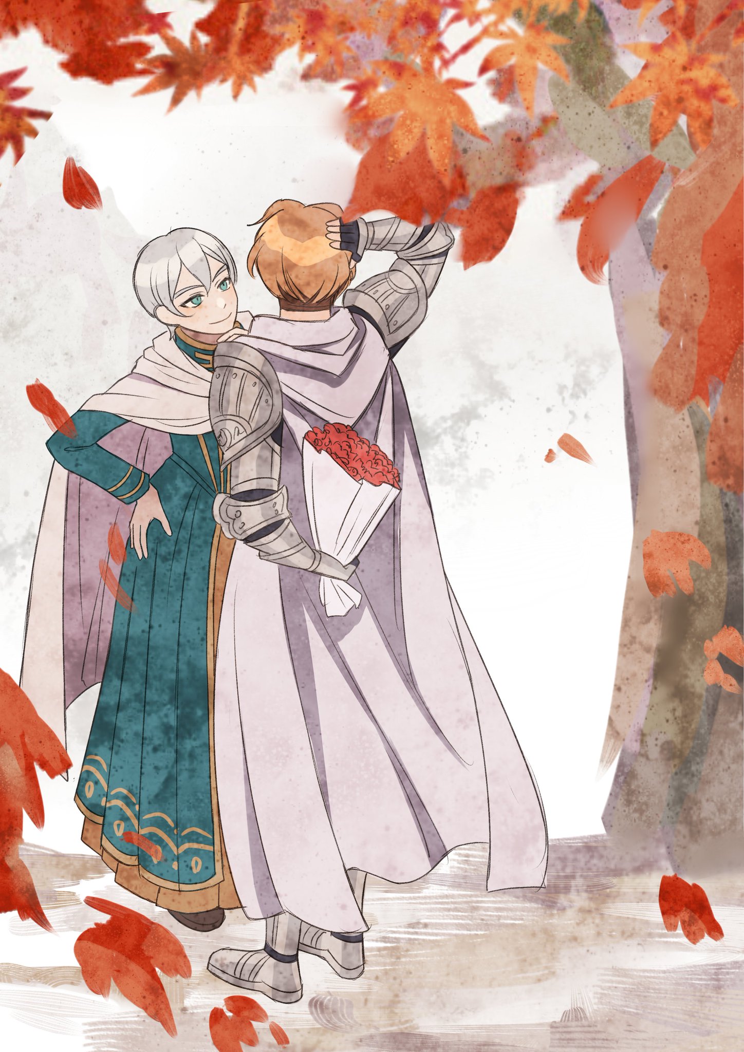 2boys arm_behind_back arm_behind_head armor bouquet brown_hair cape closed_mouth commentary_request crick_(octopath_traveler) falling_leaves flower fuwarenren hair_between_eyes hand_on_own_hip highres holding holding_bouquet knight leaf long_sleeves looking_at_another male_focus maple_leaf multiple_boys octopath_traveler octopath_traveler_ii outdoors red_flower short_hair smile standing temenos_mistral tree white_cape white_hair yaoi