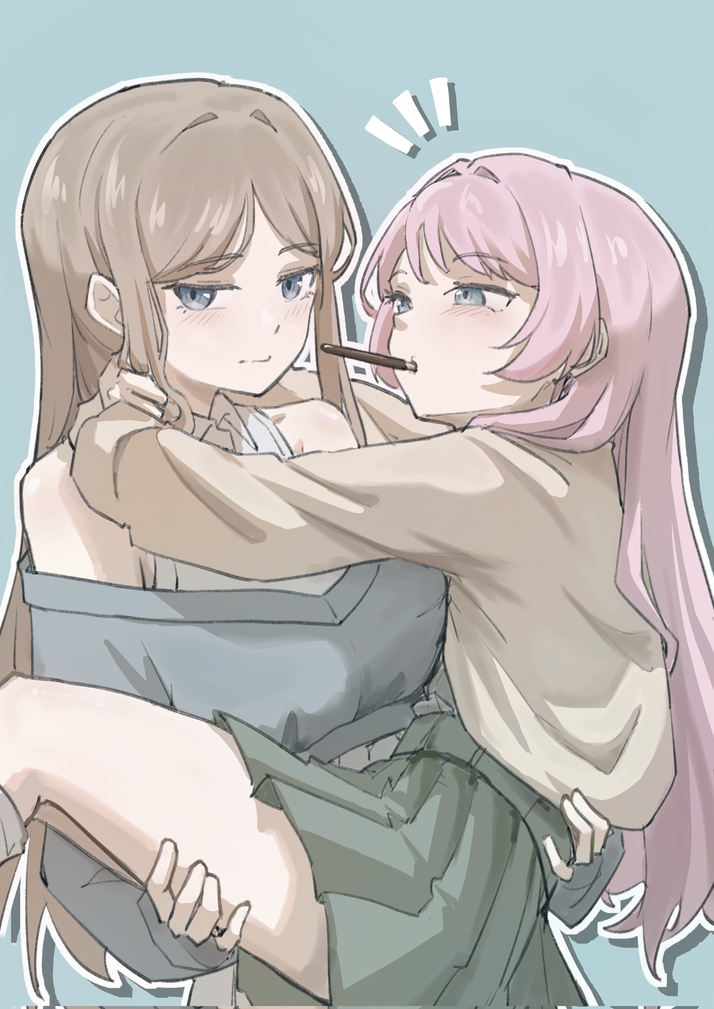 2girls bang_dream! bang_dream!_it's_mygo!!!!! blue_background blue_eyes blush brown_hair brown_shirt chihaya_anon chinese_commentary closed_mouth commentary_request corrupted_twitter_file dazhong_(dazhong02312) food food_in_mouth grey_eyes grey_skirt highres long_hair long_sleeves multiple_girls nagasaki_soyo off-shoulder_sweater off_shoulder outline pink_hair pocky pocky_in_mouth purple_eyes shirt simple_background skirt sweater white_outline yuri