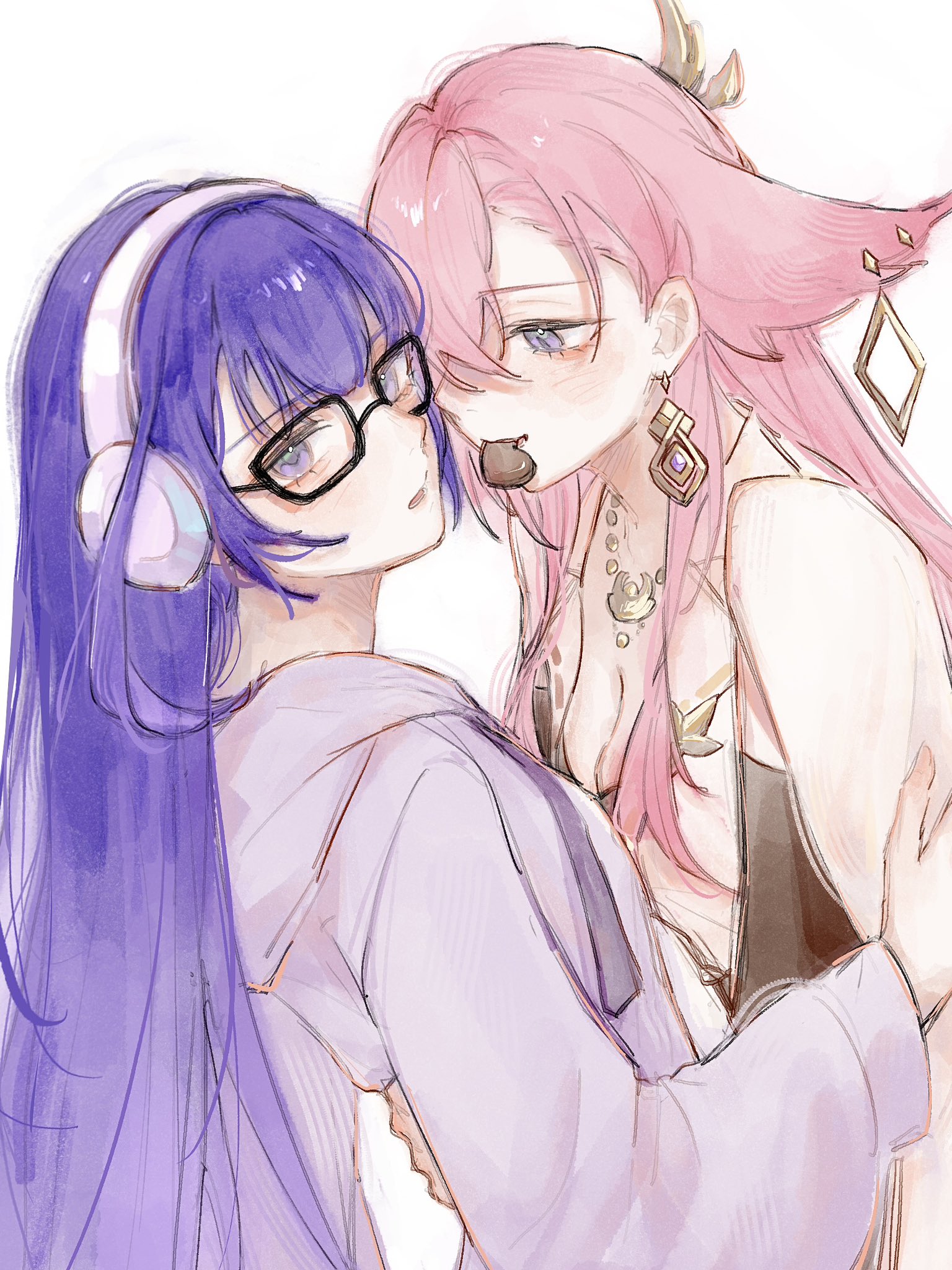 2girls animal_ears chocolate commentary earrings english_commentary food_in_mouth fox_ears fox_girl genshin_impact glasses grey_hoodie highres hood hoodie jewelry long_hair multiple_girls pink_hair purple_eyes purple_hair raiden_shogun raiden_shogun_(2nd_anniversary) shoujolei valentine yae_miko yae_miko_(2nd_anniversary) yuri