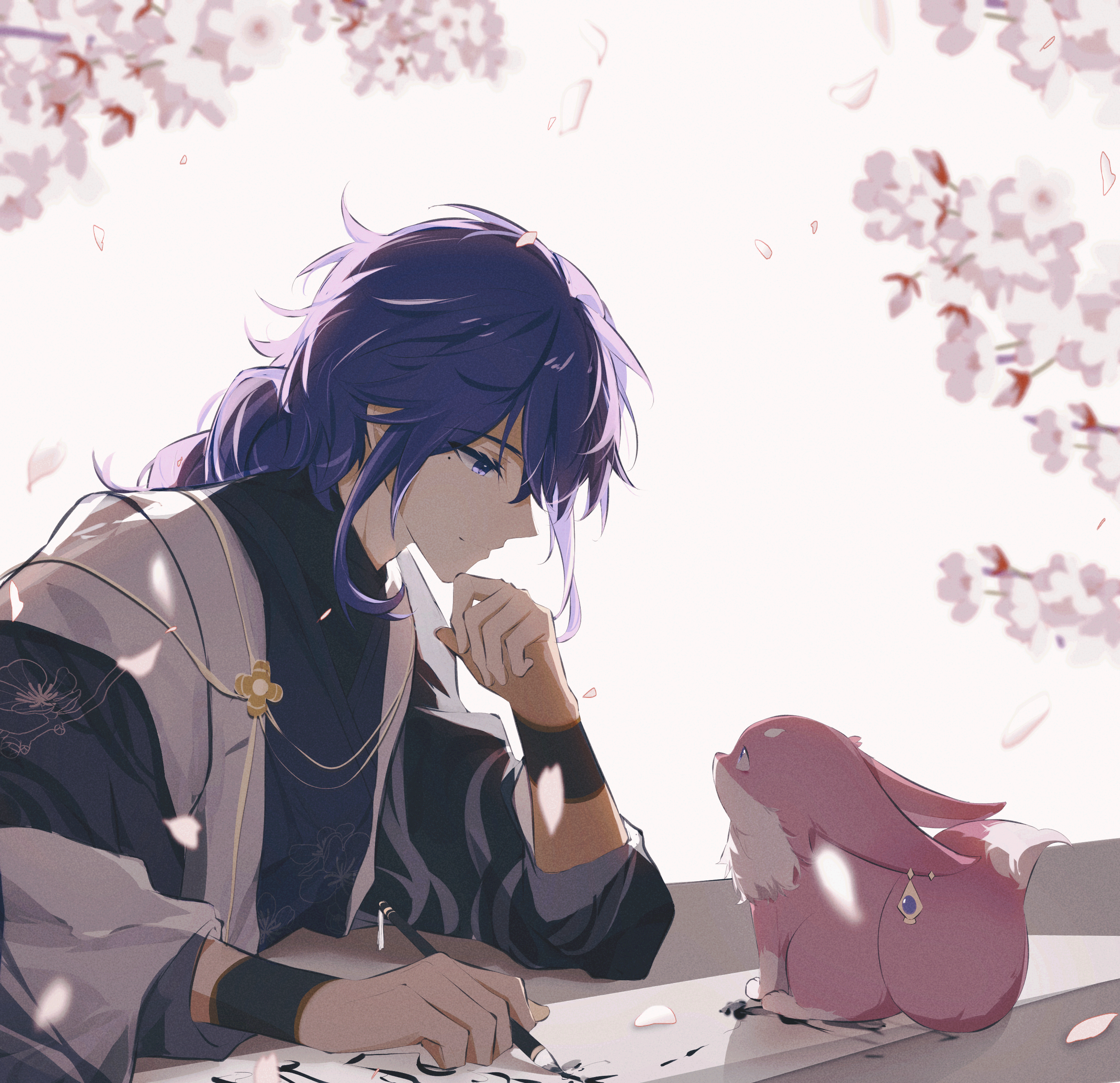 1boy absurdres alternate_costume blunt_bangs blurry blurry_background braid cherry_blossoms chinese_commentary closed_mouth commentary_request depth_of_field desk echomouse elbow_rest falling_petals fox fox_girl from_side genderswap genderswap_(ftm) genshin_impact hand_on_own_chin hetero highres japanese_clothes light_smile long_sleeves looking_at_another looking_down looking_up male_focus mole mole_under_eye petals purple_eyes purple_hair raiden_shogun single_braid sitting table wide_sleeves yae_miko