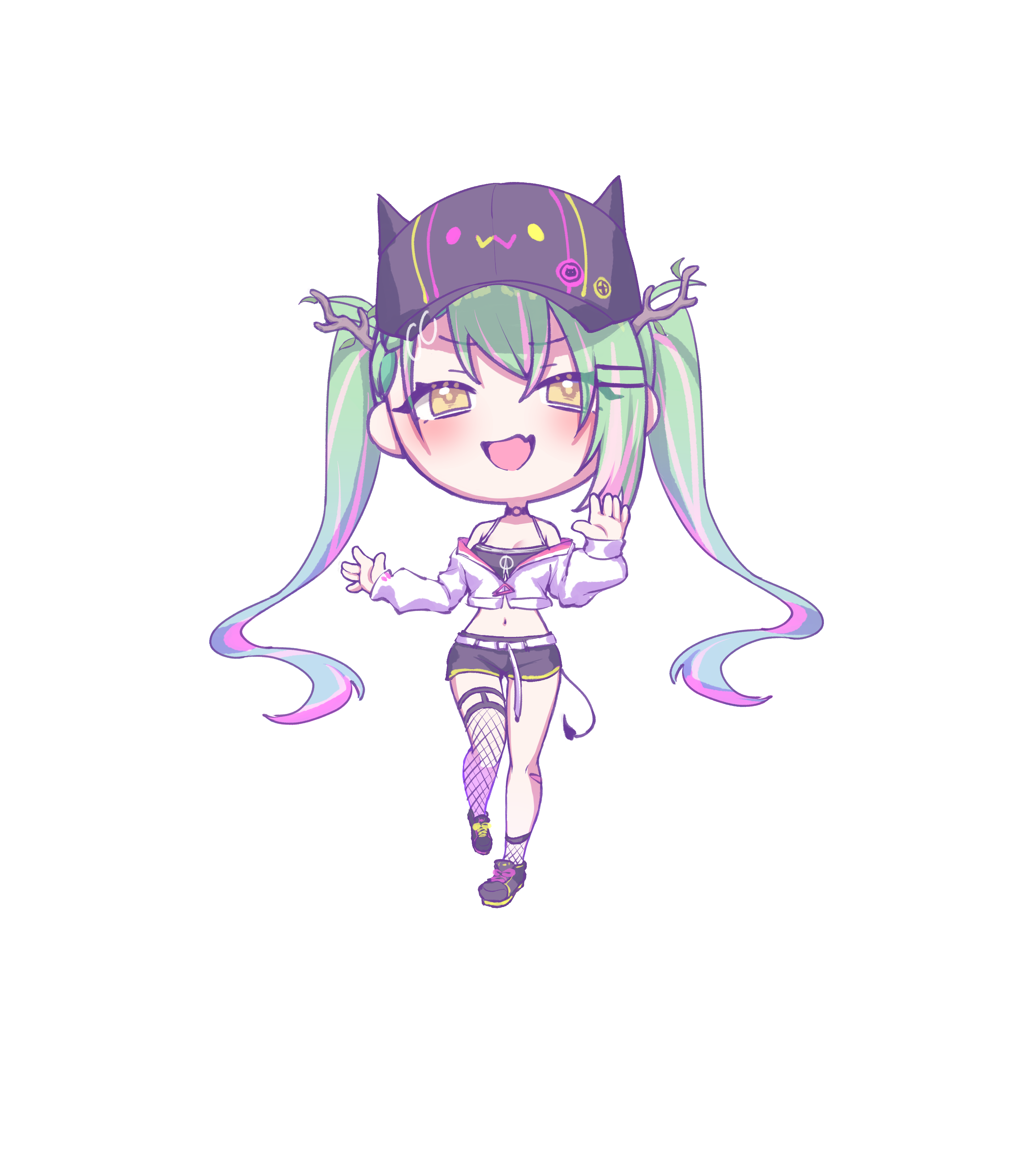 absurdres alternate_hairstyle antlers arm_at_side asymmetrical_legwear baseball_cap black_choker black_hat black_shoes black_shorts black_tank_top blurry braid braided_bangs ceres_fauna choker commentary cosplay cropped_jacket demon_girl demon_tail depth_of_field double-parted_bangs english_commentary evil_smile fake_horns fang fishnet_thighhighs fishnets full_body green_hair hair_ornament hairclip hand_up hat highres hololive hololive_english horned_headwear horns jacket long_hair long_sleeves midriff multicolored_hair o-ring o-ring_choker open_mouth parallel_hairclips pink_streaks sher_(imnotsher) shoes short_shorts shorts simple_background single_thighhigh skin_fang smile smug sneakers streaked_hair tail tank_top thighhighs tokoyami_towa tokoyami_towa_(1st_costume) tokoyami_towa_(cosplay) twintails uneven_legwear v-shaped_eyebrows virtual_youtuber white_background white_jacket yellow_eyes