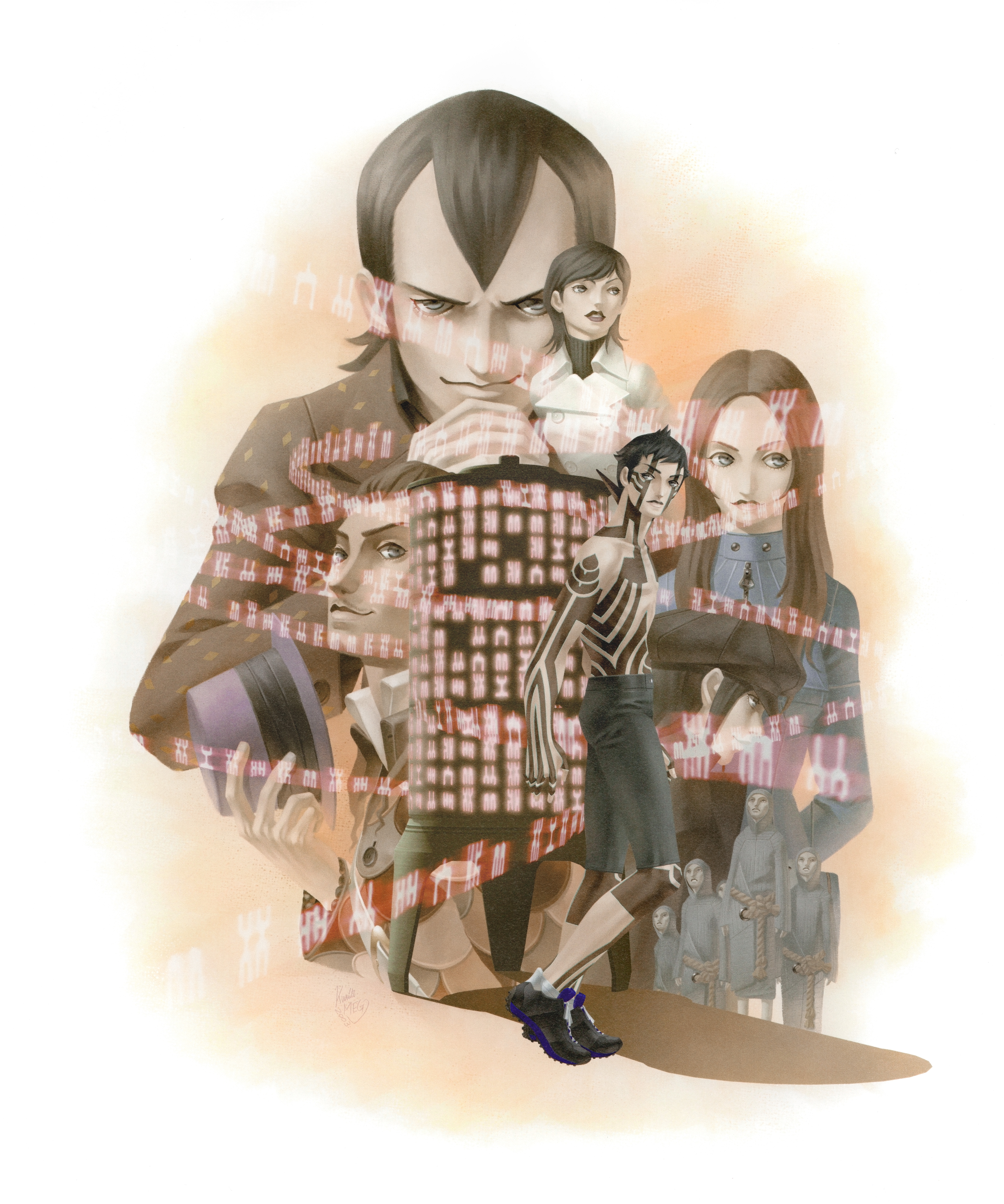 >:) 2girls 4boys 4others absurdres black_hair black_hat black_shoes black_shorts brown_hair coat demi-fiend evil_smile from_side full-body_tattoo grey_robe hat highres hijiri_jyouji hikawa_(megami_tensei) holding holding_unworn_clothes holding_unworn_hat horns kazuma_kaneko long_hair looking_at_viewer looking_to_the_side manikin_(megami_tensei) multiple_boys multiple_girls multiple_others newsboy_cap nitta_isamu official_art orange_background own_hands_clasped own_hands_together peacoat robe rope_belt shin_megami_tensei shin_megami_tensei_iii:_nocturne shiraishi_megumi_(colorist) shoes short_hair shorts single_horn smile sneakers tachibana_chiaki_(megami_tensei) takao_yuko tattoo third-party_source topless_male turtleneck two-tone_background unworn_hat unworn_headwear v-shaped_eyebrows white_background white_coat