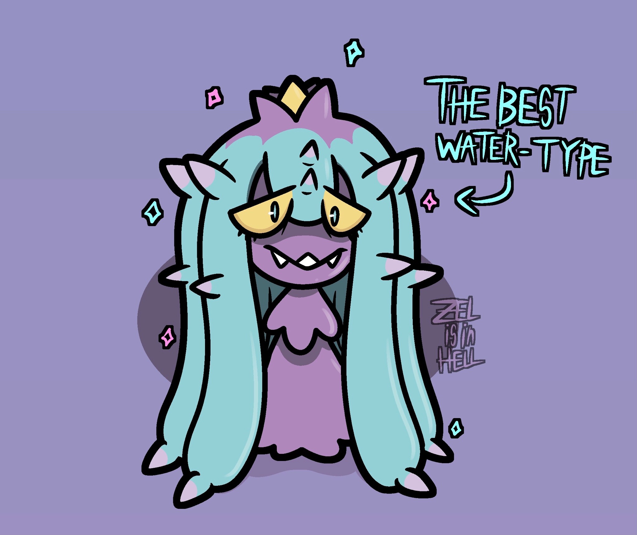 blue_eyes colored_sclera english_text fangs gen_7_pokemon highres looking_at_viewer mareanie nintendo pokemon pokemon_(creature) purple_background simple_background solo spikes yellow_sclera zelisinhell