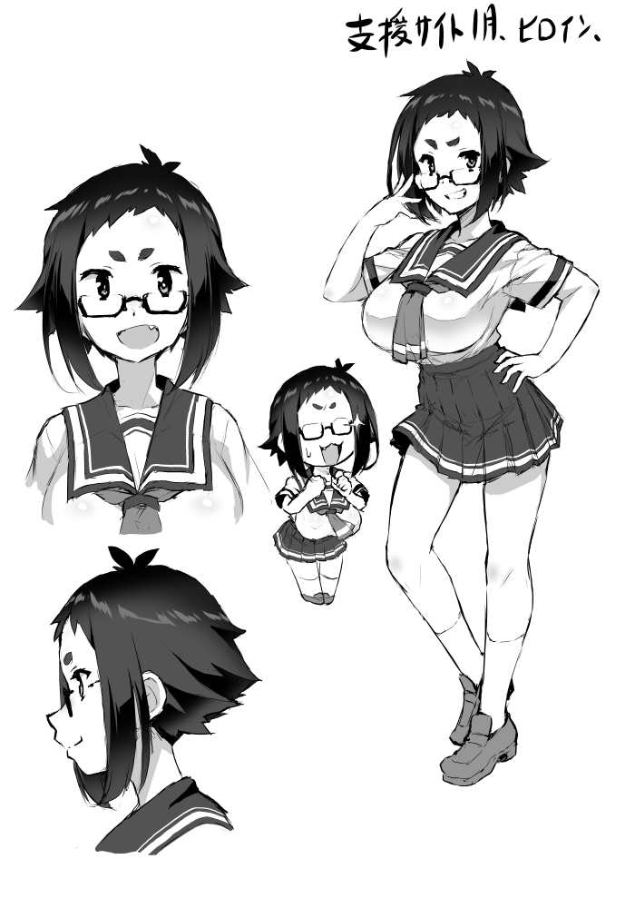 1girl ahoge breasts commentary_request fang glasses large_breasts loafers long_hair neckerchief original otoo_(izanagi) pleated_skirt sailor_collar school_uniform serafuku shoes short_hair sidelocks simple_background skirt smile socks solo thick_eyebrows white_background
