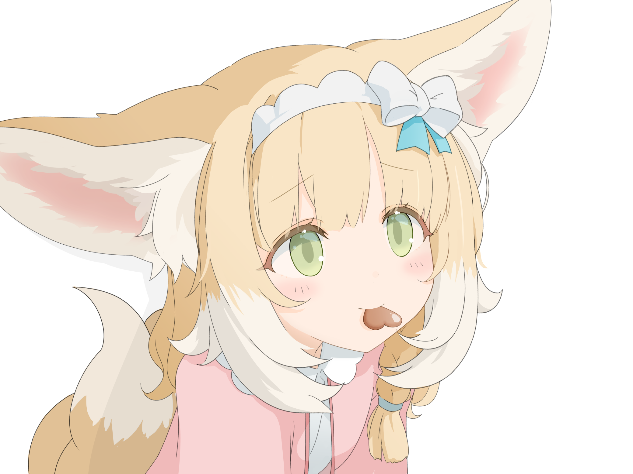 1girl animal_ears arknights blonde_hair bow candy chocolate chocolate_heart commentary_request fie_in_b86 food grey_hair hairband heart heart-shaped_food highres light_blush looking_ahead medium_hair mouth_hold pink_shirt shirt simple_background solo suzuran_(arknights) tail upper_body valentine white_background white_bow white_hairband