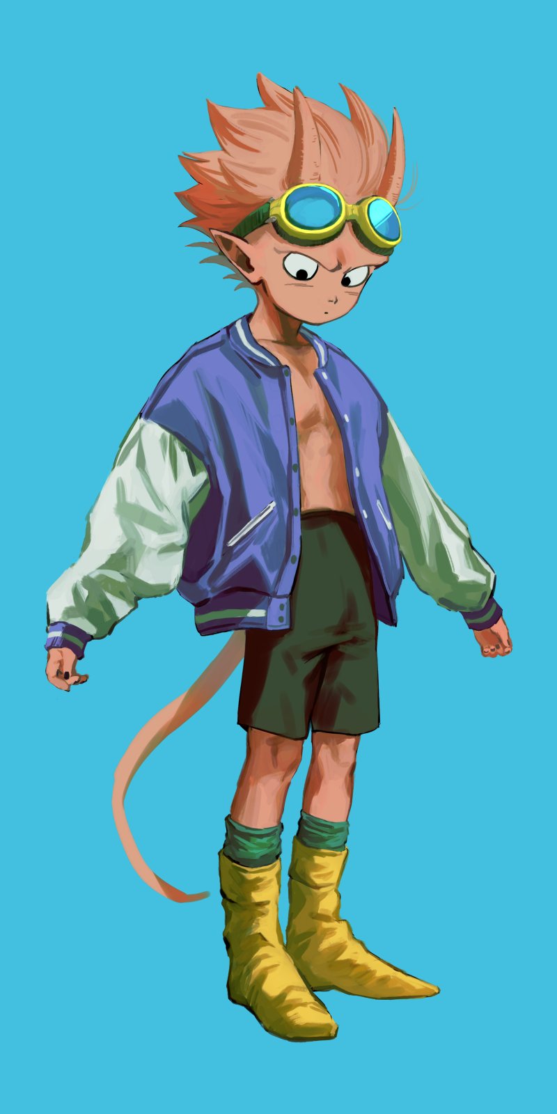 1boy beelzebub_(sand_land) blue_background colored_skin full_body goggles goggles_on_head highres horns jacket looking_down male_focus open_clothes open_jacket pink_skin pointy_ears sand_land short_hair shorts solo standing yoyoha_chan