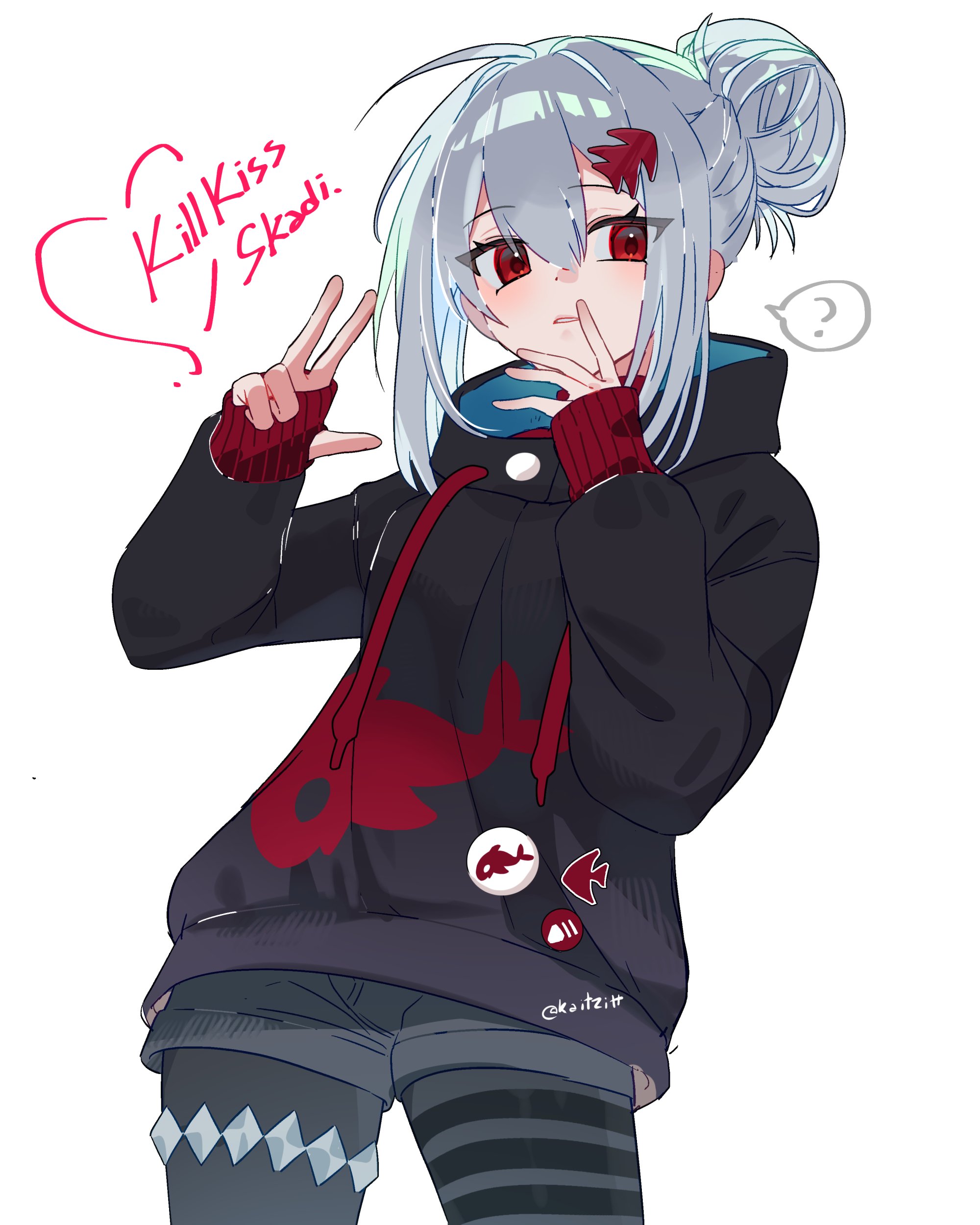 1girl ? absurdres aki'z alternate_costume arknights asymmetrical_pantyhose black_hoodie black_shorts cowboy_shot grey_hair hair_bun hair_ornament hairclip highres hood hoodie killkiss_(bang_dream!) looking_at_viewer pantyhose pantyhose_under_shorts red_eyes shorts simple_background single_hair_bun skadi_(arknights) solo spoken_question_mark thumb_hole_sleeves twitter_username white_background