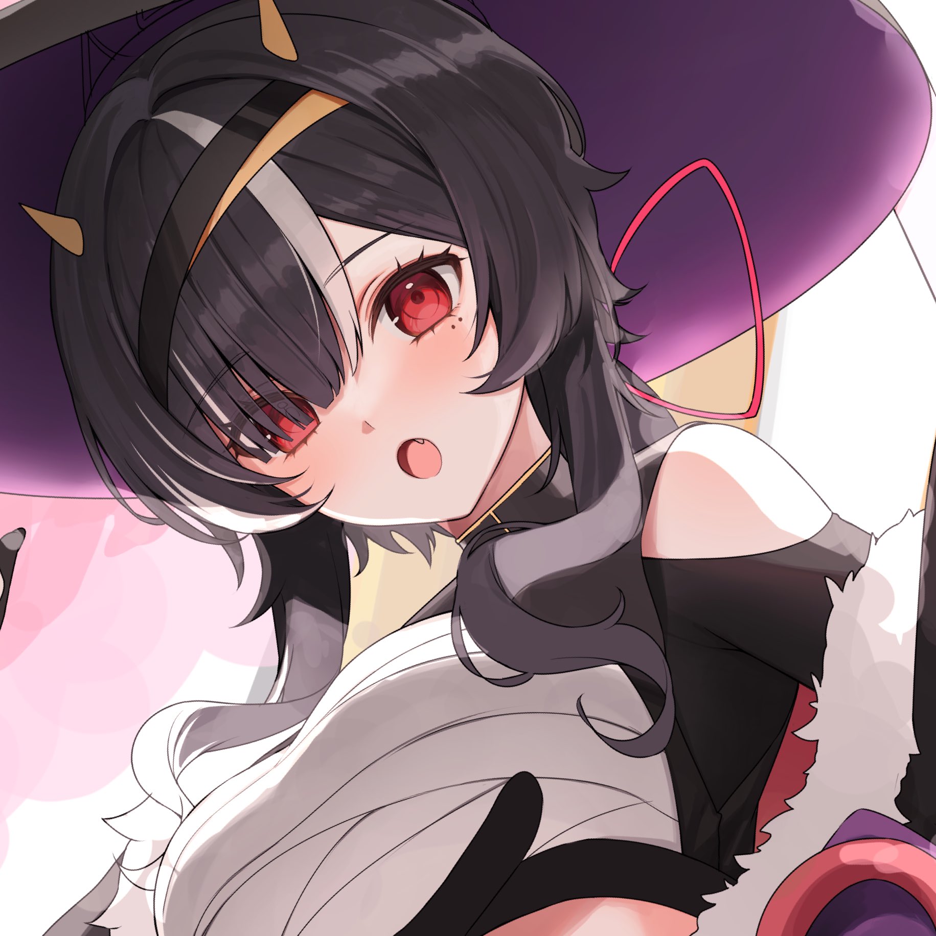 0707_una black_hair black_shirt blush bow chest_sarashi colored_inner_hair commentary_request demon_horns fang fur_trim hat headband highres horns indie_virtual_youtuber jellyfish_cut long_bangs looking_at_viewer mole mole_under_eye multicolored_hair one_eye_covered oni original red_eyes sarashi shirt turtleneck two-tone_hair una0707 virtual_youtuber white_hair