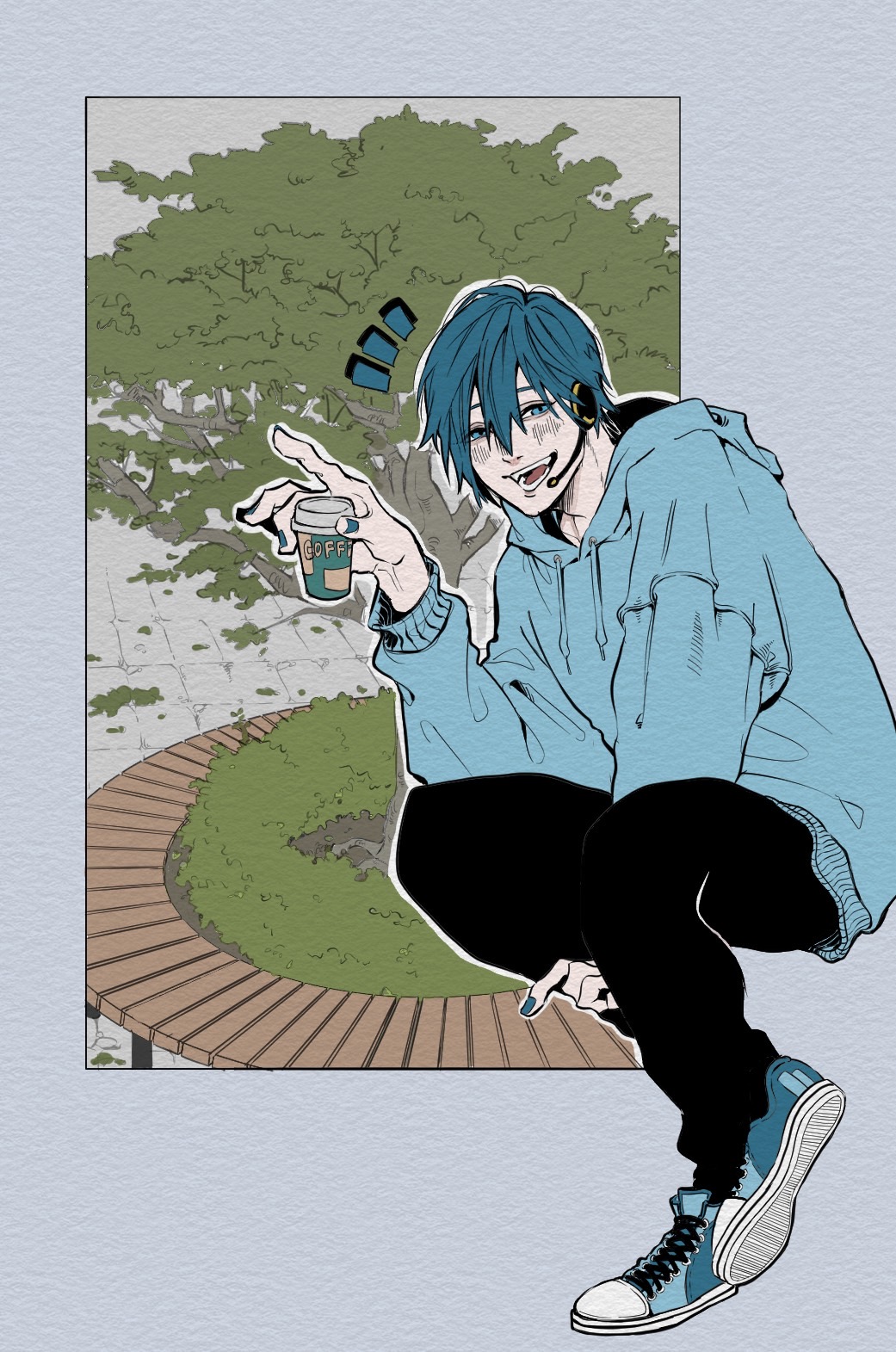 1boy alternate_costume black_pants blue_eyes blue_hair blue_hoodie blue_nails blue_shoes commentary_request cup disposable_cup drawstring hair_between_eyes headset highres holding holding_cup hood hood_down hoodie invisible_chair kaito_(vocaloid) long_sleeves looking_at_viewer male_focus nail_polish open_mouth pants sadara_bk201 shoes short_hair sitting smile sneakers solo teeth tree vocaloid