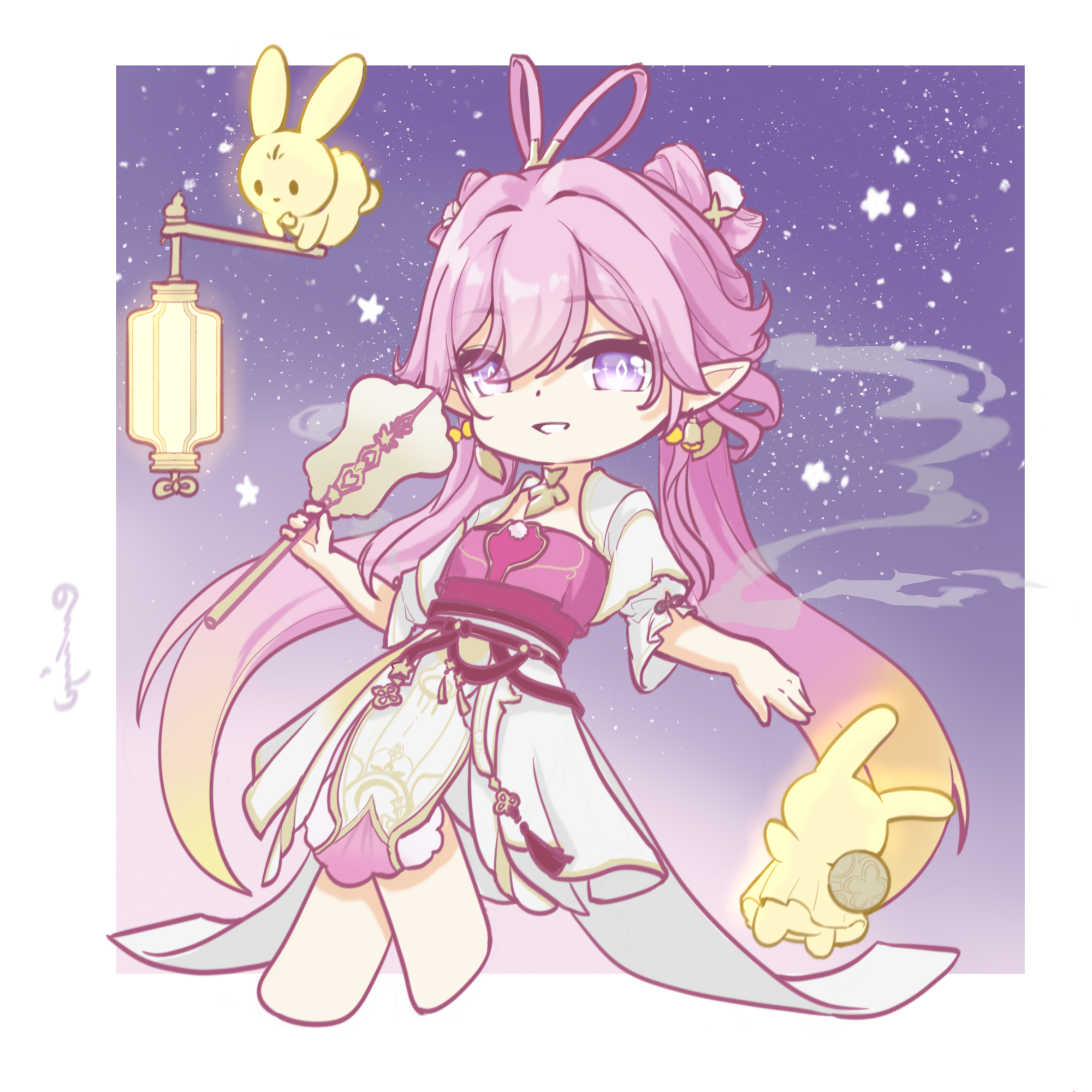 1girl baili_baigal blonde_hair chinese_clothes chinese_commentary chinese_hairstyle commentary_request diamond-shaped_pupils diamond_(shape) dress earrings elf elysia_(hi_love_elf)_(honkai_impact) elysia_(honkai_impact) elysia_(lunar_grace)_(honkai_impact) gradient_hair hand_fan highres holding holding_fan honkai_(series) honkai_impact_3rd jewelry lantern long_hair looking_at_viewer multicolored_hair official_alternate_costume paper_lantern pink_dress pink_hair pointy_ears purple_eyes rabbit sky sky_lantern smile solo star_(sky) starry_sky symbol-shaped_pupils two-tone_hair very_long_hair white_dress