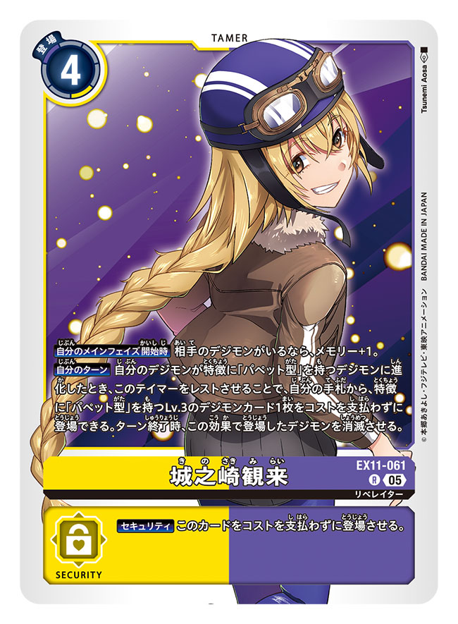 1girl artist_name blonde_hair blue_helmet braid brown_jacket card_(medium) character_name commentary_request copyright_name digimon digimon_(creature) digimon_card_game digimon_liberator from_behind goggles goggles_on_headwear helmet jacket kinosaki_mirai long_hair looking_at_viewer looking_back official_art parted_lips purple_background smile solo trading_card translation_request tsunemi_aosa