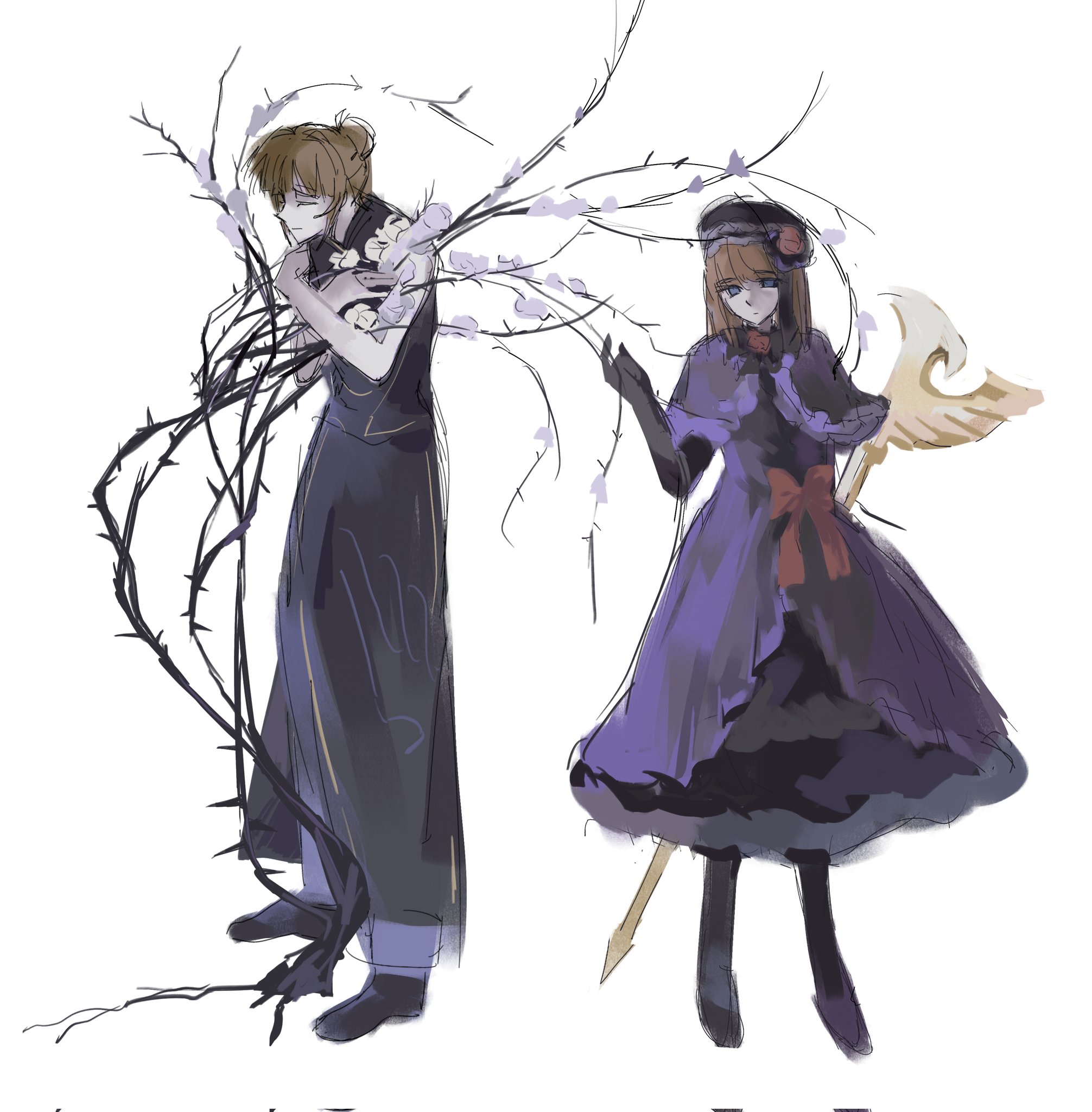 1111 2girls black_gloves capelet china_dress chinese_clothes closed_eyes dress dual_persona eva_beatrice expressionless flower gloves hair_bun hashtag-only_commentary highres hugging_object multiple_girls orange_hair purple_capelet purple_dress red_flower red_rose rose staff thorns umineko_no_naku_koro_ni ushiromiya_eva white_background
