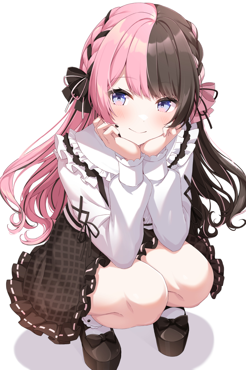 1girl black_bow black_hair black_nails black_ribbon black_shoes black_skirt blue_eyes bow braid closed_mouth commentary_request footwear_bow frilled_sailor_collar frills full_body hair_bow hair_ribbon hands_on_own_face highres kurono_yuzuko long_hair long_sleeves multicolored_eyes multicolored_hair multiple_hair_bows nail_polish pink_bow pink_eyes pink_hair pink_nails pink_ribbon plaid_clothes plaid_skirt ribbon sailor_collar shirt shoes side_braids simple_background skirt socks solo split-color_hair squatting streaked_hair tachibana_hinano tachibana_hinano_(1st_costume) virtual_youtuber vspo! white_background white_sailor_collar white_shirt white_socks