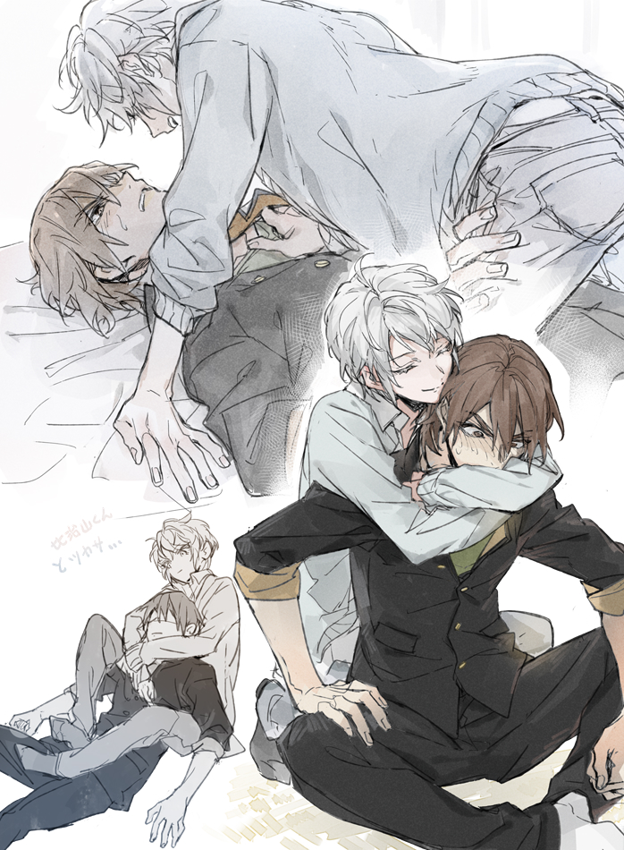 2boys arms_around_neck black_jacket blue_cardigan blush boy_on_top brown_hair cardigan closed_eyes commentary_request embarrassed gakuran hijiyama_takatoshi hug hug_from_behind jacket juusan_kihei_bouei_ken koto_(gamelife506) light_smile looking_at_another lying male_focus multiple_boys multiple_views okino_tsukasa_(2188) on_back pants school_uniform short_hair simple_background sitting white_background white_hair yaoi