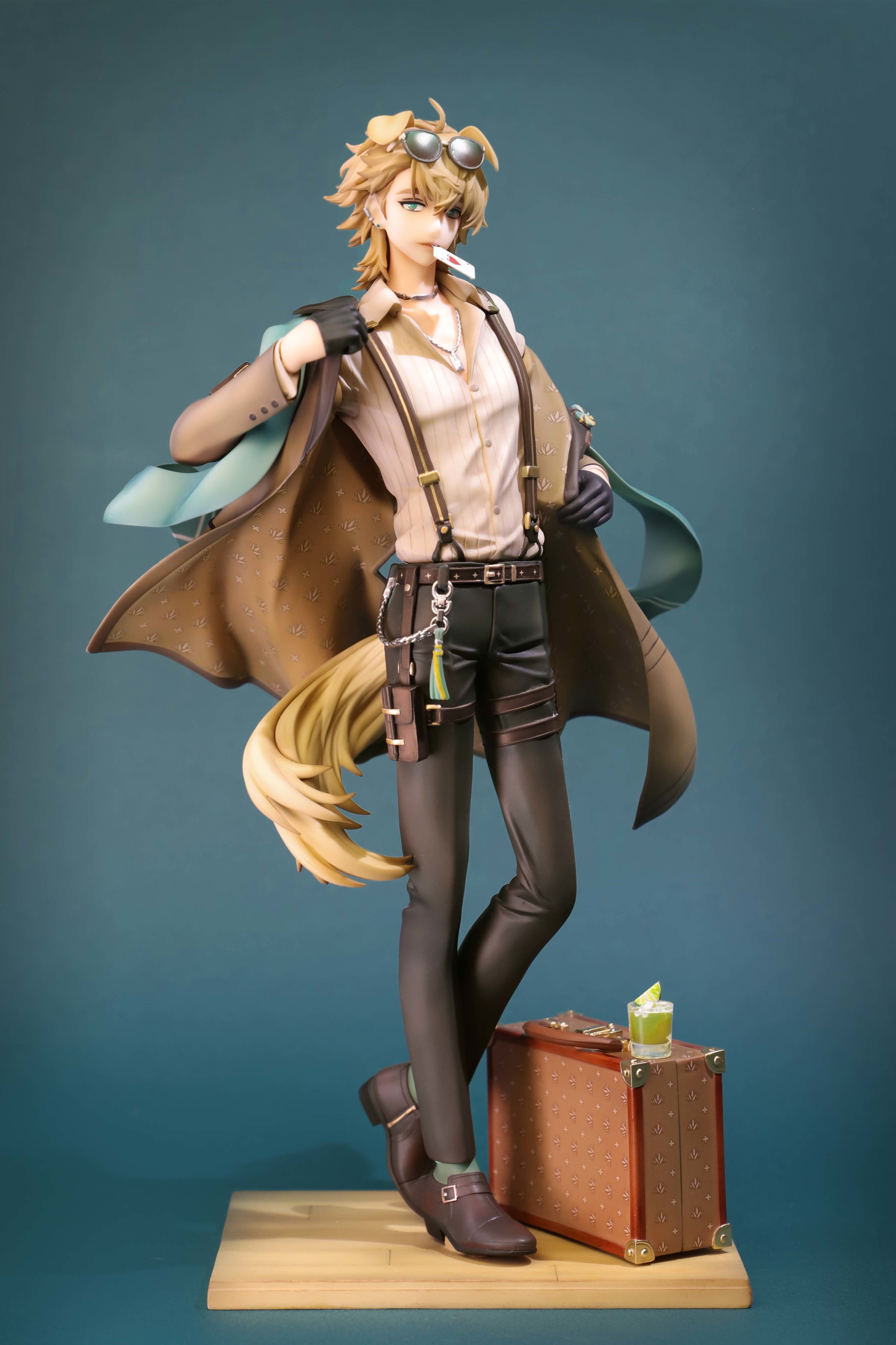 1boy absurdres ahoge alcohol ambience_synesthesia animal_ears aqua_eyes aqua_socks arknights artist_collaboration asymmetrical_bangs belt belt_buckle black_gloves black_pants blonde_hair blue_background briefcase brown_belt brown_coat brown_shoes buckle buttoned_cuffs buttons card card_in_mouth choker coat commentary_request crossed_bangs cup dog_boy dog_ears dog_tags dog_tail dress_pants dress_shirt drink drinking_glass earclip earrings extra_ears eyewear_on_head faux_figurine figure_(medium) figure_stage floppy_ears food formal_clothes fruit full_body gloves grey-framed_eyewear hair_behind_ear half_gloves heart heel_up highres hzzz jewelry lapels lime_(fruit) lime_slice long_sleeves looking_at_viewer male_focus monk_shoes mouth_hold mullet multiple_thigh_straps necklace notched_lapels open_clothes open_coat open_collar opened_by_self pants patterned_clothing photo_(medium) pinstripe_pattern pinstripe_shirt playing_card pouch print_coat ribbed_shirt rikka33 shirt shirt_tucked_in shoe_buckle shoes short_hair short_sideburns sideburns simple_background socks solo standing standing_on_one_leg stud_earrings suit sunglasses suspenders tail tassel tequila_(arknights) tequila_(cardwinner)_(arknights) thigh_belt thigh_pouch thigh_strap white_shirt wooden_floor yellow_tail