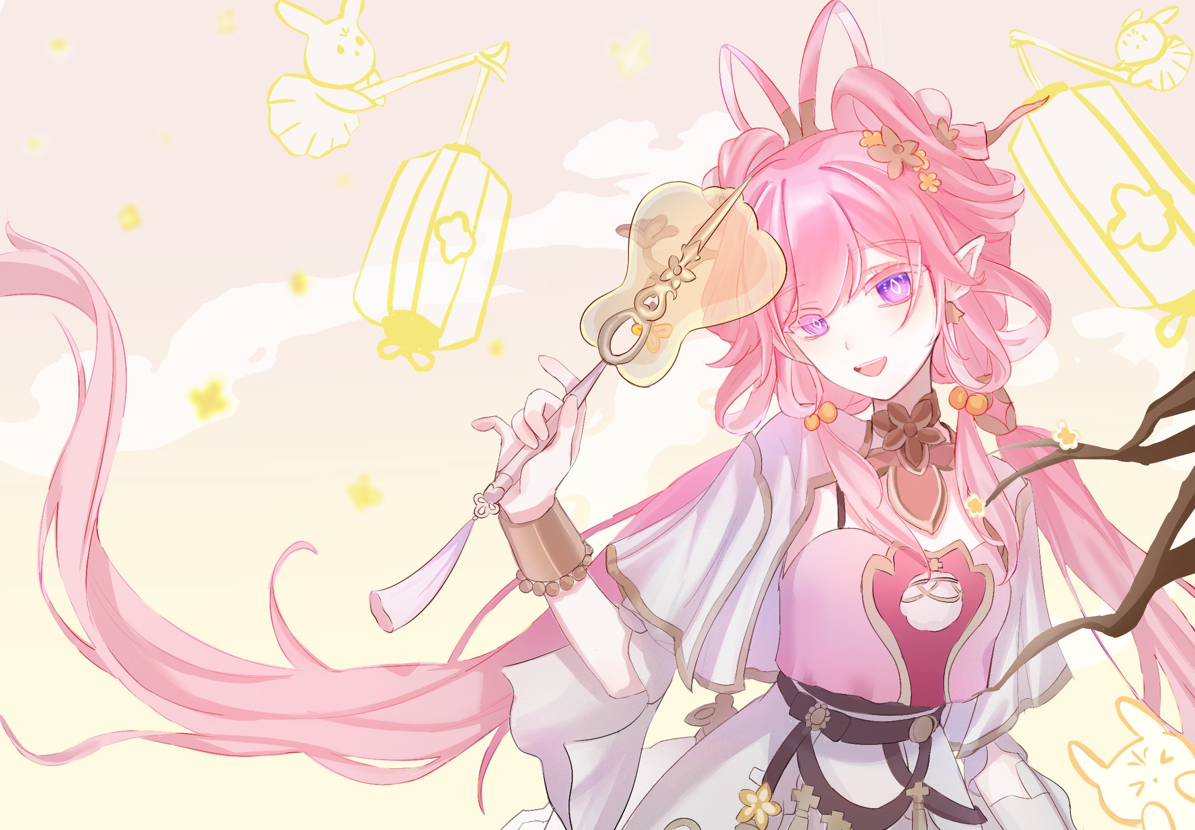 1girl branch breasts chinese_clothes chinese_commentary chinese_hairstyle commentary_request diamond-shaped_pupils diamond_(shape) dress earrings elf elysia_(hi_love_elf)_(honkai_impact) elysia_(honkai_impact) elysia_(lunar_grace)_(honkai_impact) hand_fan highres holding holding_fan honkai_(series) honkai_impact_3rd jewelry lantern large_breasts long_hair looking_at_viewer official_alternate_costume paper_lantern pink_dress pink_sky pointy_ears rabbit sky sky_lantern smile solo symbol-shaped_pupils very_long_hair white_dress zaoanyaoyao