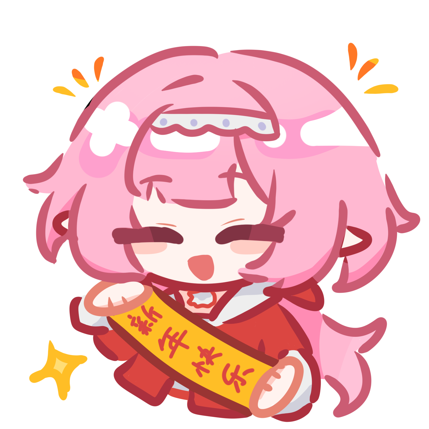1girl chibi chibi_only chinese_commentary chinese_new_year chinese_text coat commentary_request elf elysia_(honkai_impact) hairband happy_new_year highres holding honkai_(series) honkai_impact_3rd liye_yy long_hair new_year pink_hair pointy_ears red_coat simple_background smile solo star_(symbol) translation_request very_long_hair white_background white_hairband