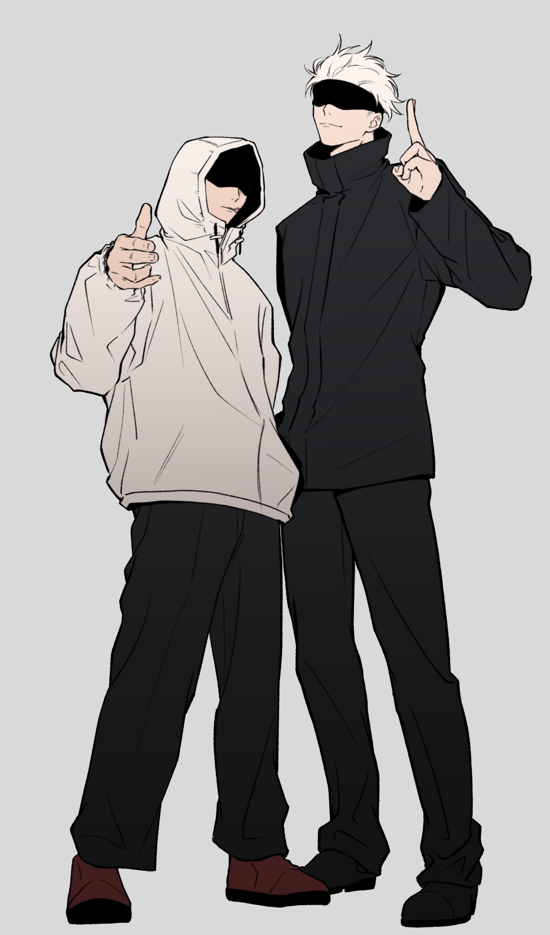 2boys absurdres black_jacket blindfold commentary_request crossed_fingers gojo_satoru hair_pulled_back highres hood hooded_jacket itadori_yuji jacket jujutsu_kaisen jujutsu_kaisen_modulo male_focus multiple_boys mzn_320 shaded_face teacher_and_student white_hair