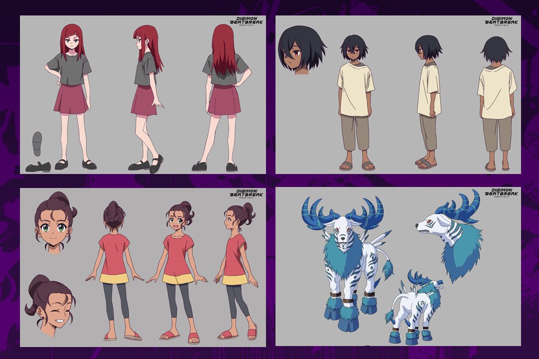 1boy 2girls dark-skinned_female dark-skinned_male dark_skin digimon digimon_(creature) digimon_beatbreak full_body granit_(digimon) horns looking_at_viewer moosemon multiple_girls official_art ponytail reference_sheet sakuya_reina short_hair simple_background skirt smile stella_(digimon) toei_company