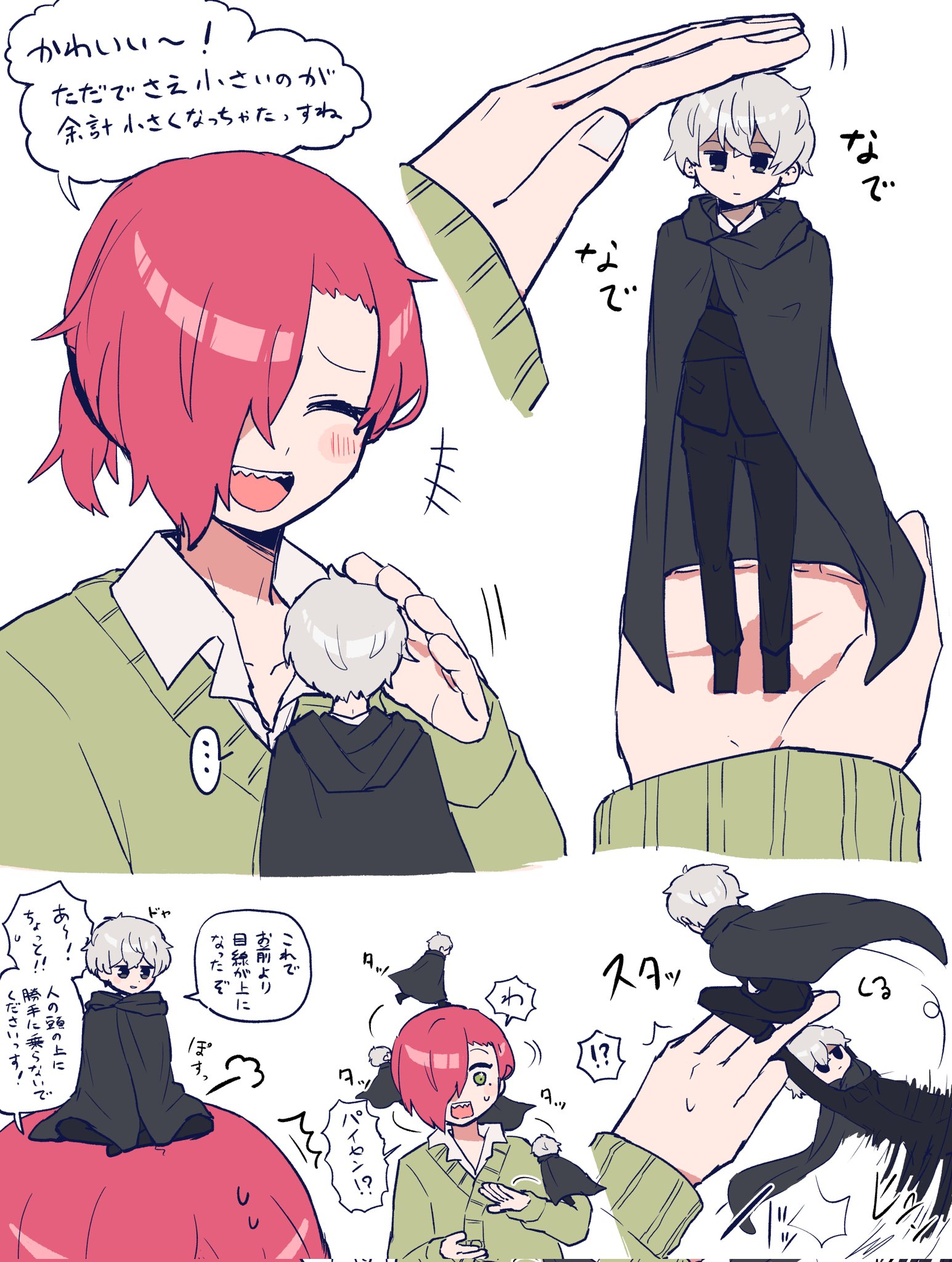 +++ 2boys :d black_cloak black_pants black_shirt blush cardigan cloak closed_eyes collared_shirt commentary_request crossed_arms green_cardigan grey_hair headpat highres kuchinashi_dabi mini_person miniboy mole mole_under_eye multiple_boys okudo61 open_collar open_mouth oshi_no_taisetsuna_hito_ni_narikawaru pants red_hair shirt sitting sitting_on_person smile standing_on_another's_hand tonimura_yui translation_request white_shirt