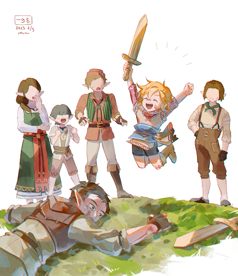 1girl 5boys black_hair blonde_hair boots closed_eyes full_body grass happy holding holding_sword holding_weapon injury link multiple_boys nintendo no_eyes open_mouth pointy_ears rain_rkgk sidelocks simple_background smile surprised sword the_legend_of_zelda the_legend_of_zelda:_breath_of_the_wild the_legend_of_zelda:_tears_of_the_kingdom weapon white_background wooden_sword