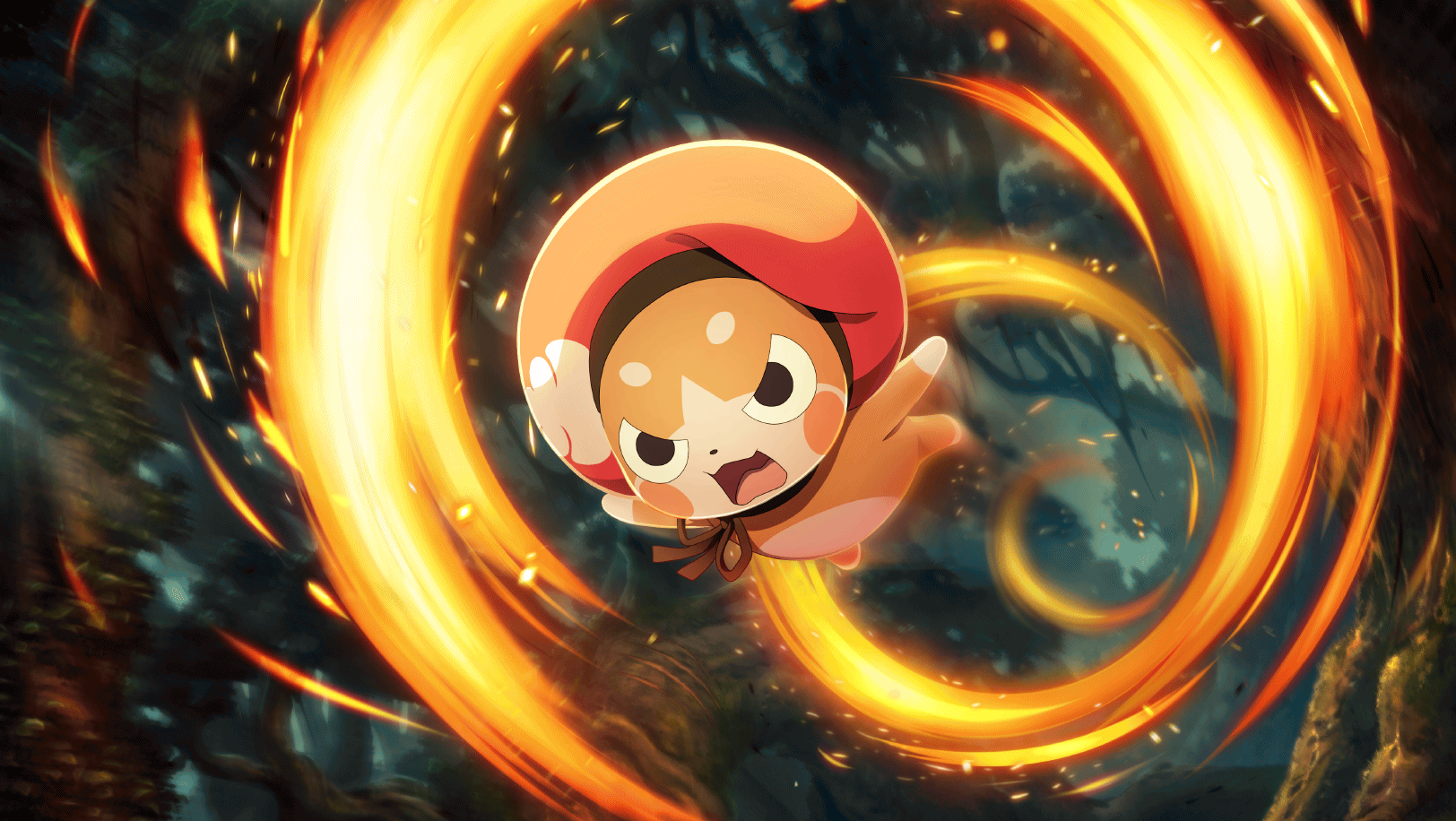 artist_request commentary creature dark english_commentary fire flying forest full_body game_cg hat highres looking_at_viewer magic mascot midair nature normin_(tales) official_art open_mouth outdoors phoenix_(tales) plant_roots red_hat ribbon solo tales_of_(series) tales_of_berseria tales_of_crestoria tales_of_zestiria third-party_source tree
