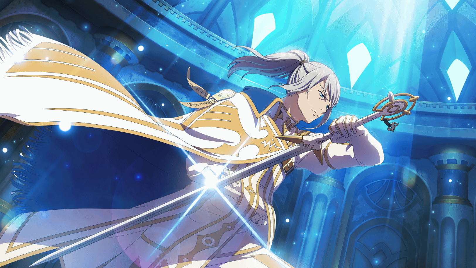 1boy artist_request artorius_collbrande blue_eyes broken_arm cape church closed_mouth cowboy_shot game_cg glint gloves grey_hair hand_in_clothes highres holding holding_sword holding_weapon indoors medium_hair official_art palace pants ponytail solo standing sword tales_of_(series) tales_of_berseria tales_of_crestoria third-party_source weapon white_cape white_gloves white_pants