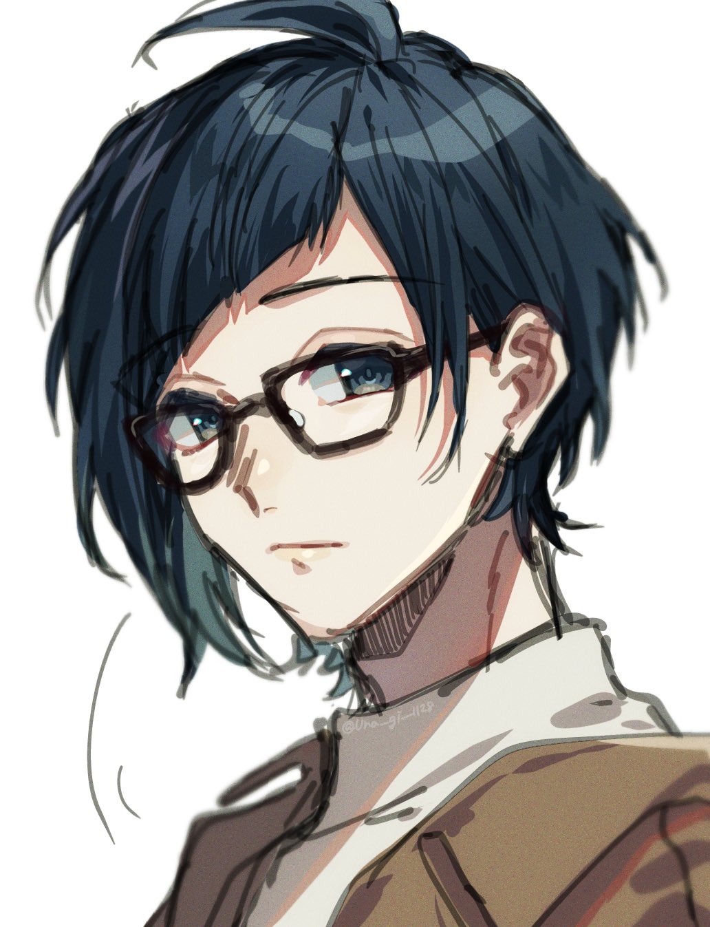 1boy ahoge artist_name asymmetrical_bangs blue_eyes blue_hair brown_jacket closed_mouth glasses highres jacket kokuhaku_jikkou_iinkai looking_at_viewer male_focus portrait shirt short_hair simple_background sketch someya_yuujirou unagi_no_buckle white_background white_shirt