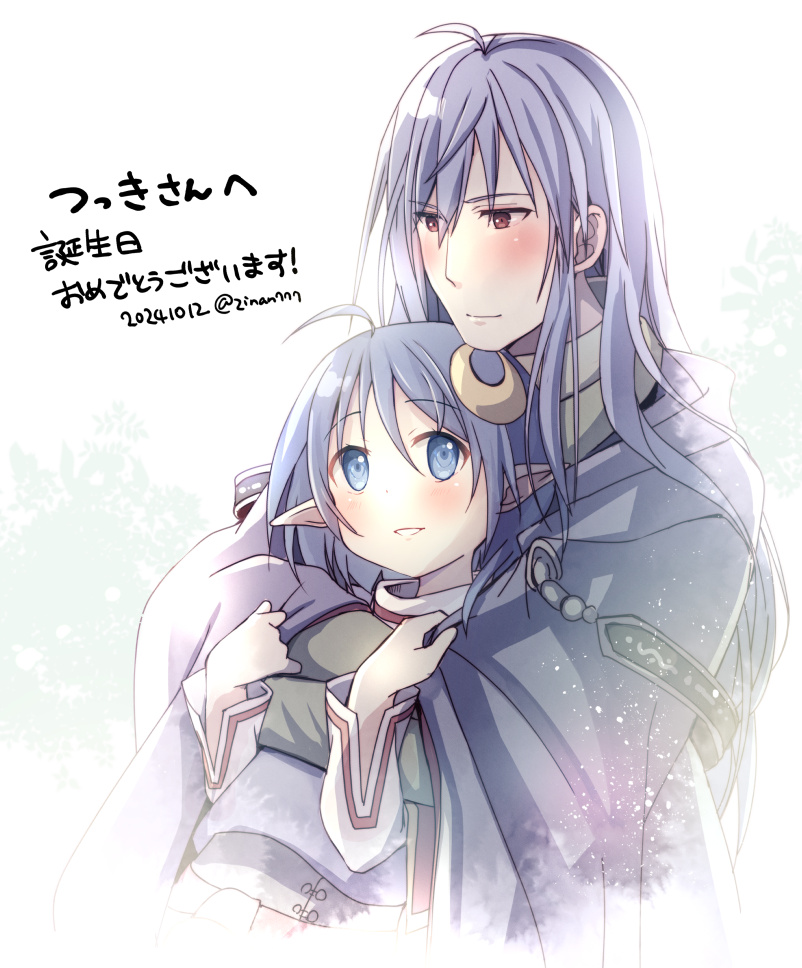 1boy 1girl ahoge blue_eyes blue_hair cape closed_mouth commentary_request crescent crescent_hair_ornament dias_flac hair_ornament long_hair open_mouth pointy_ears red_cape rena_lanford short_hair smile star_ocean star_ocean:_the_second_story white_background zinan
