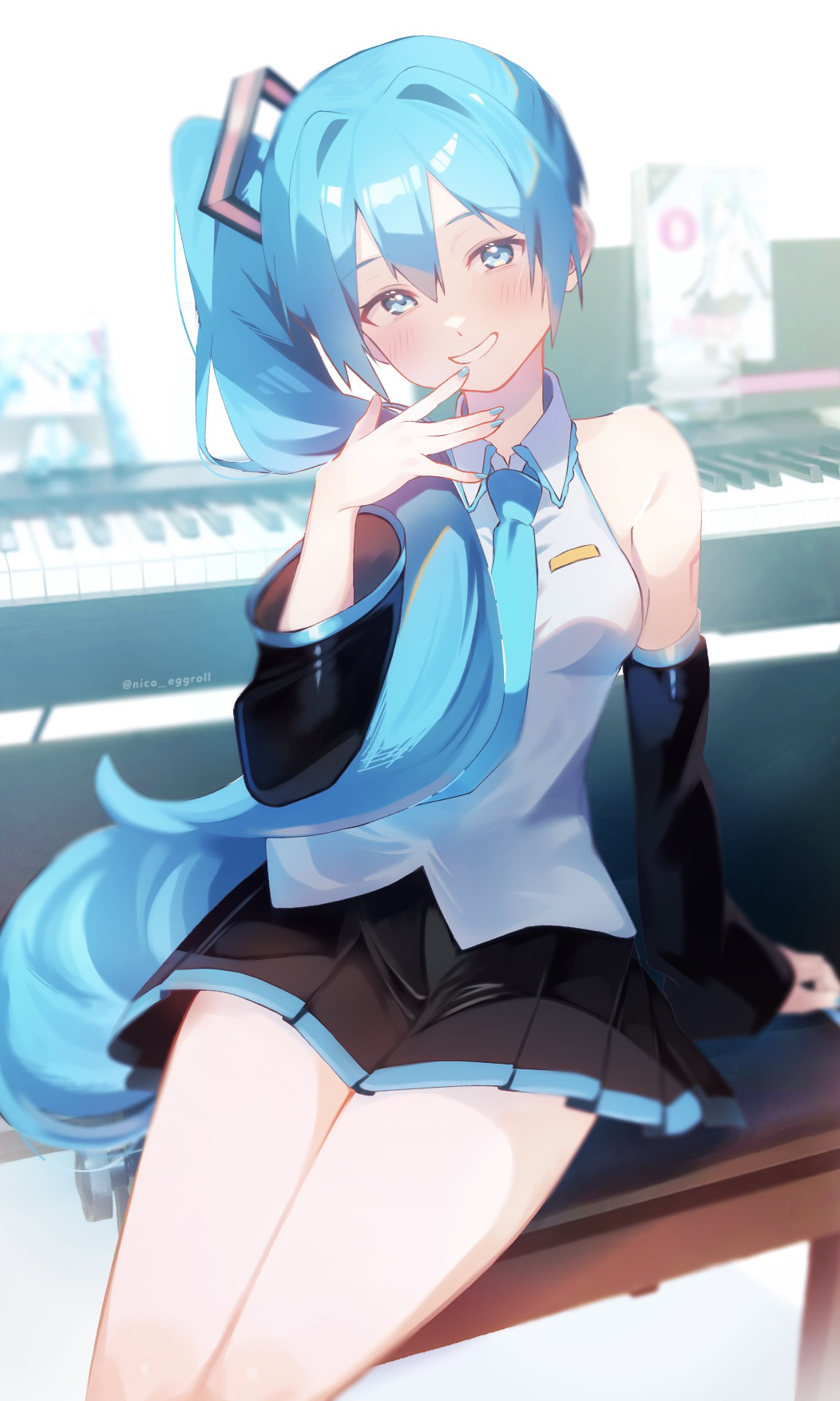 1girl alternate_hairstyle aqua_eyes aqua_hair aqua_nails aqua_necktie aqua_trim bare_shoulders black_skirt black_sleeves blurry blurry_background blush breasts collarbone collared_shirt commentary_request detached_sleeves grey_shirt hair_between_eyes hair_ornament hair_over_shoulder hand_up hatsune_miku hatsune_miku_(noodle_stopper) head_tilt headphones highres instrument long_hair long_sleeves looking_at_viewer medium_breasts meme miniskirt necktie nico_eggroll open_mouth piano pleated_skirt shirt side_ponytail sidetail_miku_noodle_stopper_(meme) sitting skirt sleeveless sleeveless_shirt smile solo twitter_username upper_body very_long_hair vocaloid wide_sleeves