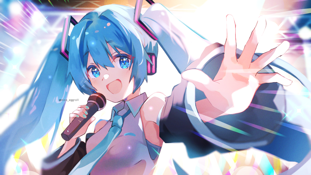 1girl aqua_eyes aqua_hair aqua_nails aqua_necktie aqua_trim black_sleeves blush breasts collared_shirt commentary_request detached_sleeves grey_shirt hair_between_eyes hair_ornament hatsune_miku headset holding holding_microphone long_sleeves looking_at_viewer microphone necktie nico_eggroll open_mouth shirt sleeveless sleeveless_shirt small_breasts smile solo twintails upper_body vocaloid wide_sleeves