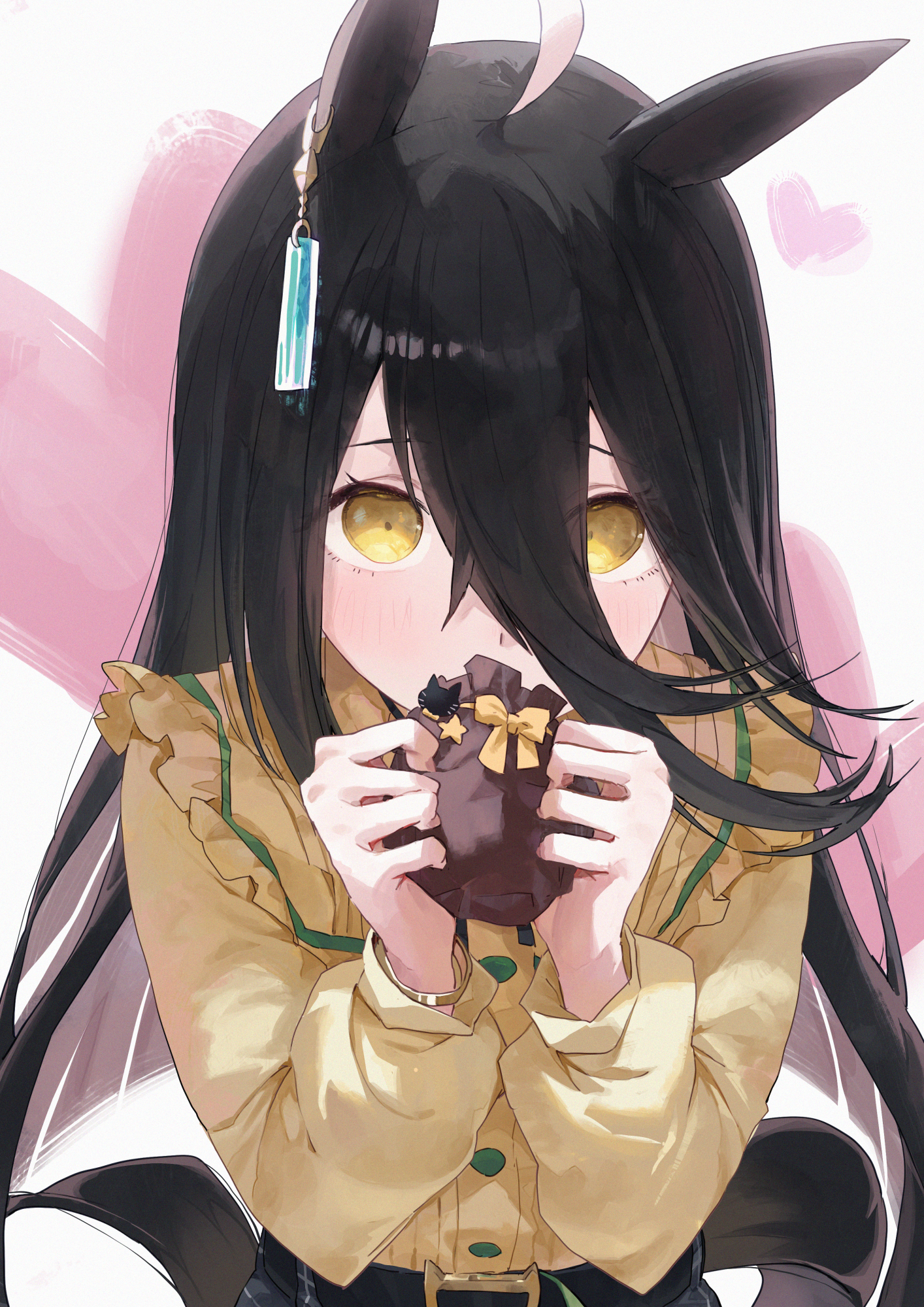1girl ahoge amano_kokoko animal_ears belt belt_buckle black_belt black_hair black_skirt buckle commentary_request covering_own_mouth earrings gift hair_between_eyes highres holding holding_gift horse_ears horse_girl jewelry long_hair long_hair_between_eyes looking_at_viewer manhattan_cafe_(casual)_(umamusume) manhattan_cafe_(umamusume) shirt single_earring skirt solo umamusume yellow_eyes yellow_shirt