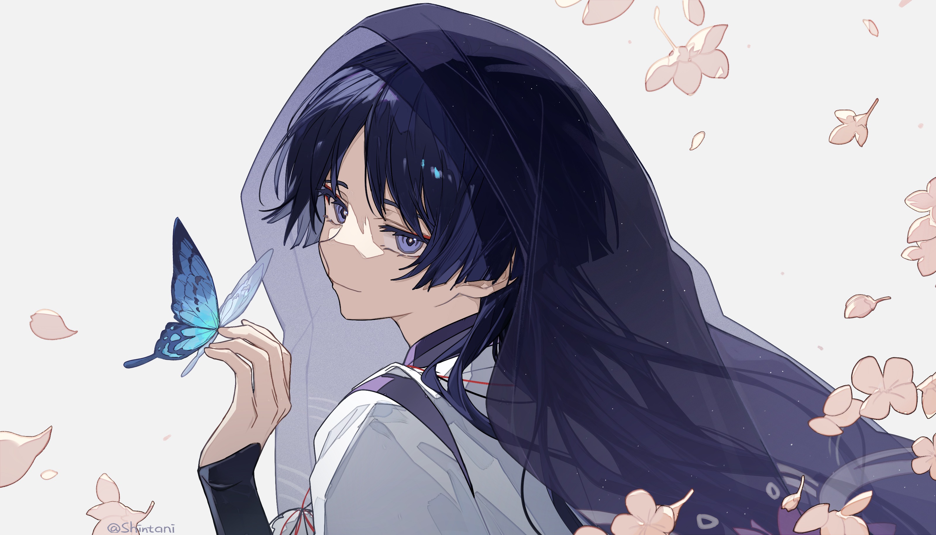 1boy absurdres blue_butterfly blue_eyes blue_hair bug butterfly butterfly_on_hand cherry_blossoms chinese_commentary closed_mouth commentary_request genshin_impact grey_background hair_between_eyes head_tilt highres insect japanese_clothes long_hair looking_at_viewer looking_to_the_side purple_veil scaramouche_(genshin_impact) scaramouche_(kabukimono)_(genshin_impact) sjengu_shintani solo upper_body veil