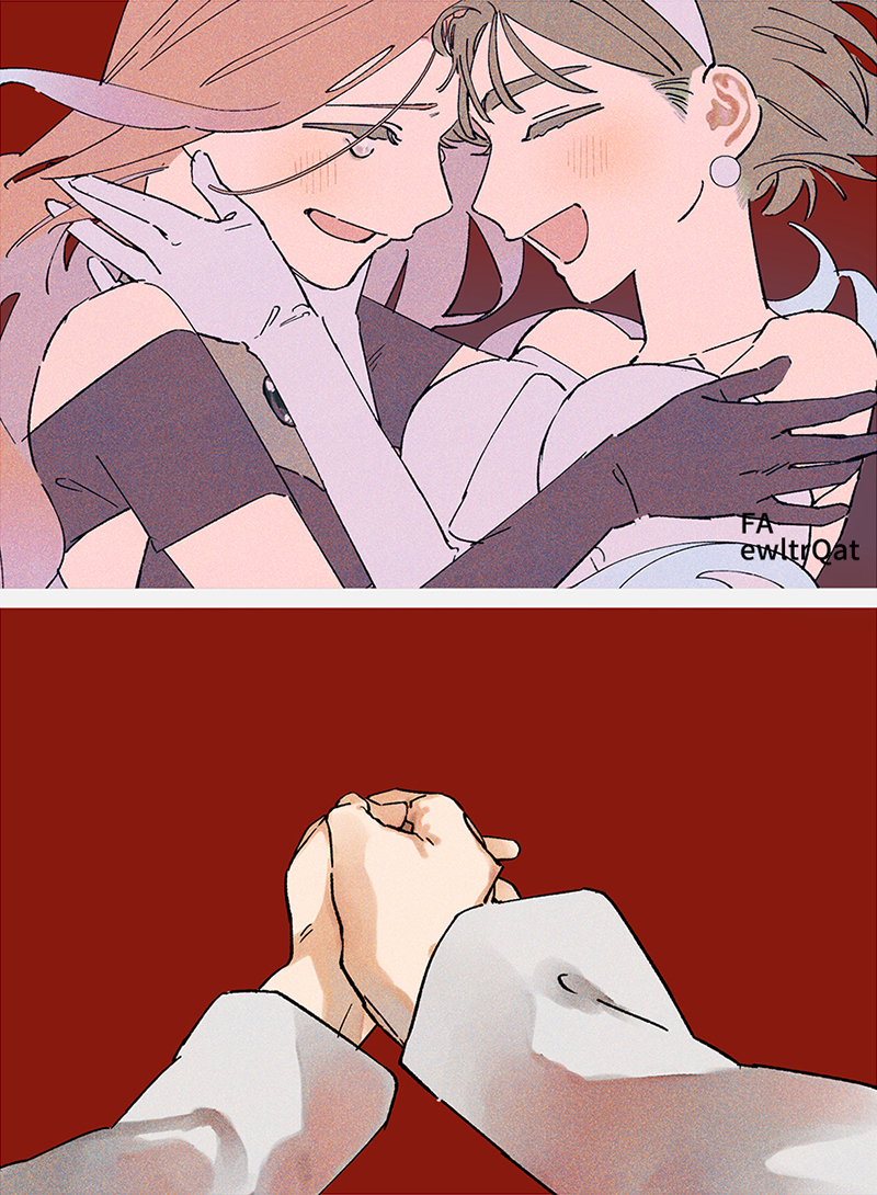 2girls alien_stage artist_name black_dress black_gloves black_hair commentary dress earrings elbow_gloves ewltrqat forehead-to-forehead gloves hairband heads_together jewelry mizi_(alien_stage) multiple_girls open_mouth pink_hair red_background short_sleeves smile sphere_earrings sua_(alien_stage) white_dress white_gloves white_hairband yuri