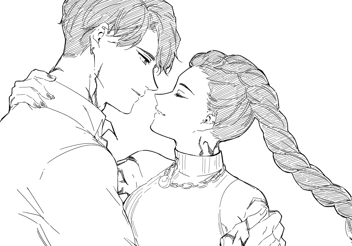 1boy 1girl body_markings braid braided_ponytail chain closed_eyes collared_shirt greyscale hashtag-only_commentary jinu_(kpop_demon_hunters) kpop_demon_hunters light_smile looking_at_another m39sb monochrome profile rumi_(kpop_demon_hunters) shirt short_hair sleeveless sleeveless_shirt smile turtleneck upper_body