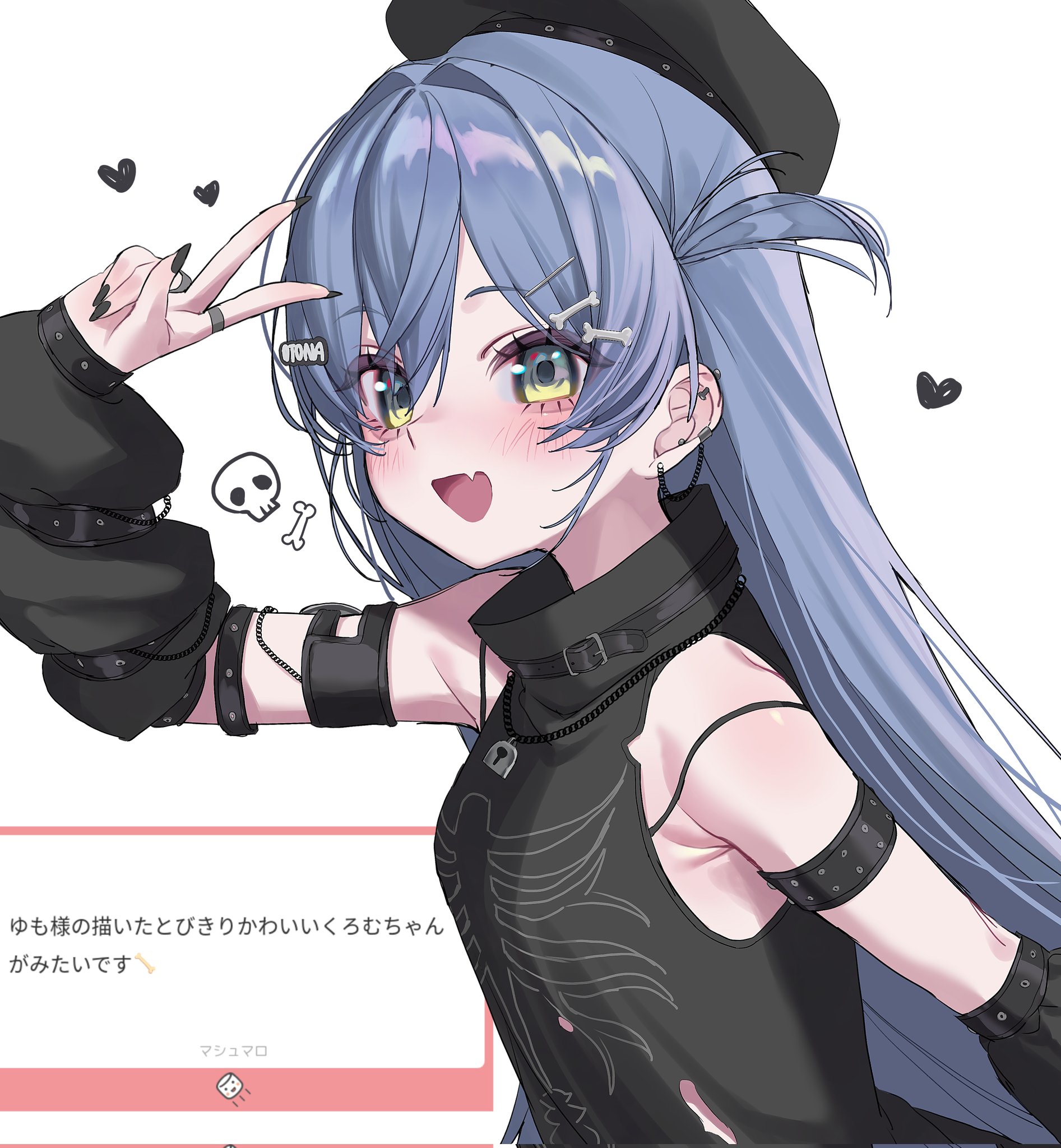 1girl :d arm_warmers beret black_arm_warmers black_hat blue_hair bone_hair_ornament commentary_request eyelashes fang green_eyes hair_ornament hairclip hand_up hat highres jewelry long_hair looking_at_viewer marshmallow_(site) multiple_rings open_mouth ring shirt simple_background skin_fang sleeveless sleeveless_shirt smile solo two_side_up upper_body v virtual_youtuber vspo! white_background yano_kuromu yano_kuromu_(1st_costume) yumo_x_x