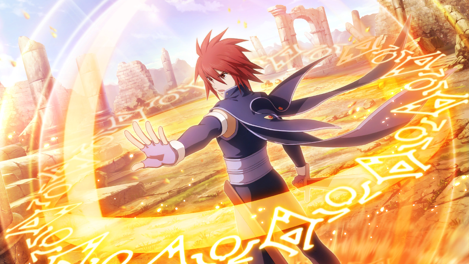 1boy artist_request belt brown_eyes cape casting_spell collared_cape commentary cowboy_shot day dirt english_commentary fingerless_gloves floating_cape game_cg gloves highres holding holding_sword holding_weapon kratos_aurion leggings magic male_focus medium_hair multiple_belts official_art open_mouth outdoors purple_belt purple_cape purple_gloves purple_leggings purple_trim red_hair rock ruins sheath solo spiked_hair standing sword tales_of_(series) tales_of_crestoria tales_of_symphonia third-party_source weapon