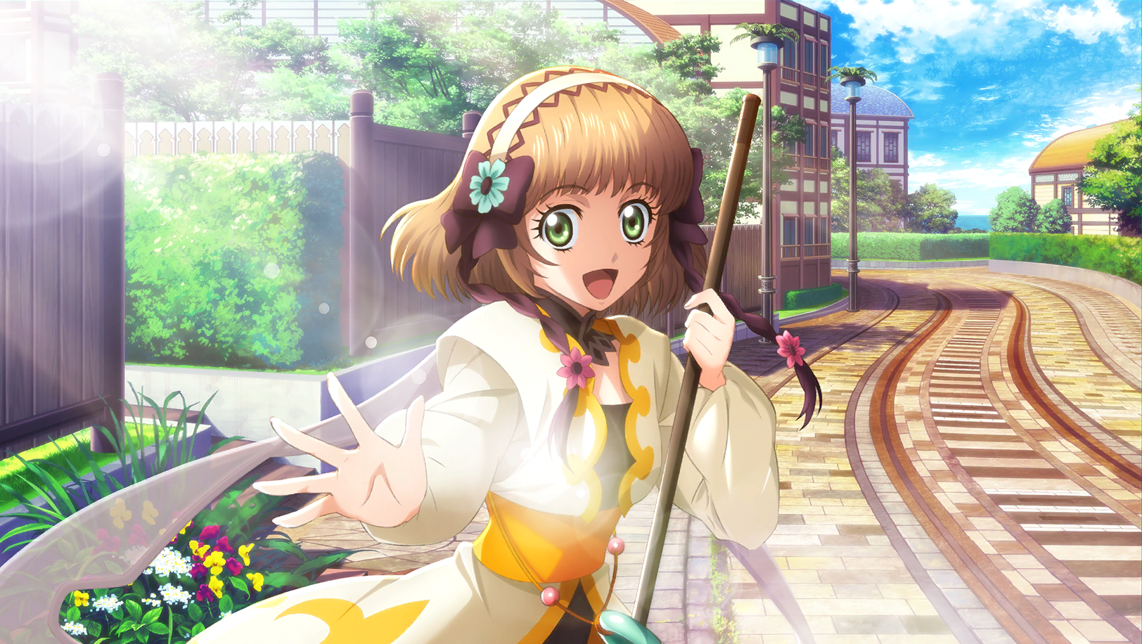 1girl artist_request black_ribbon black_unitard blue_sky breasts broom brown_hair bush cloud coat commentary cowboy_shot day english_commentary fence flower game_cg green_eyes hair_flower hair_ornament hairband highres holding holding_broom house leia_rolando looking_at_viewer official_art open_mouth ribbon road short_hair sky smile solo street sunlight tales_of_(series) tales_of_crestoria tales_of_xillia third-party_source town white_coat