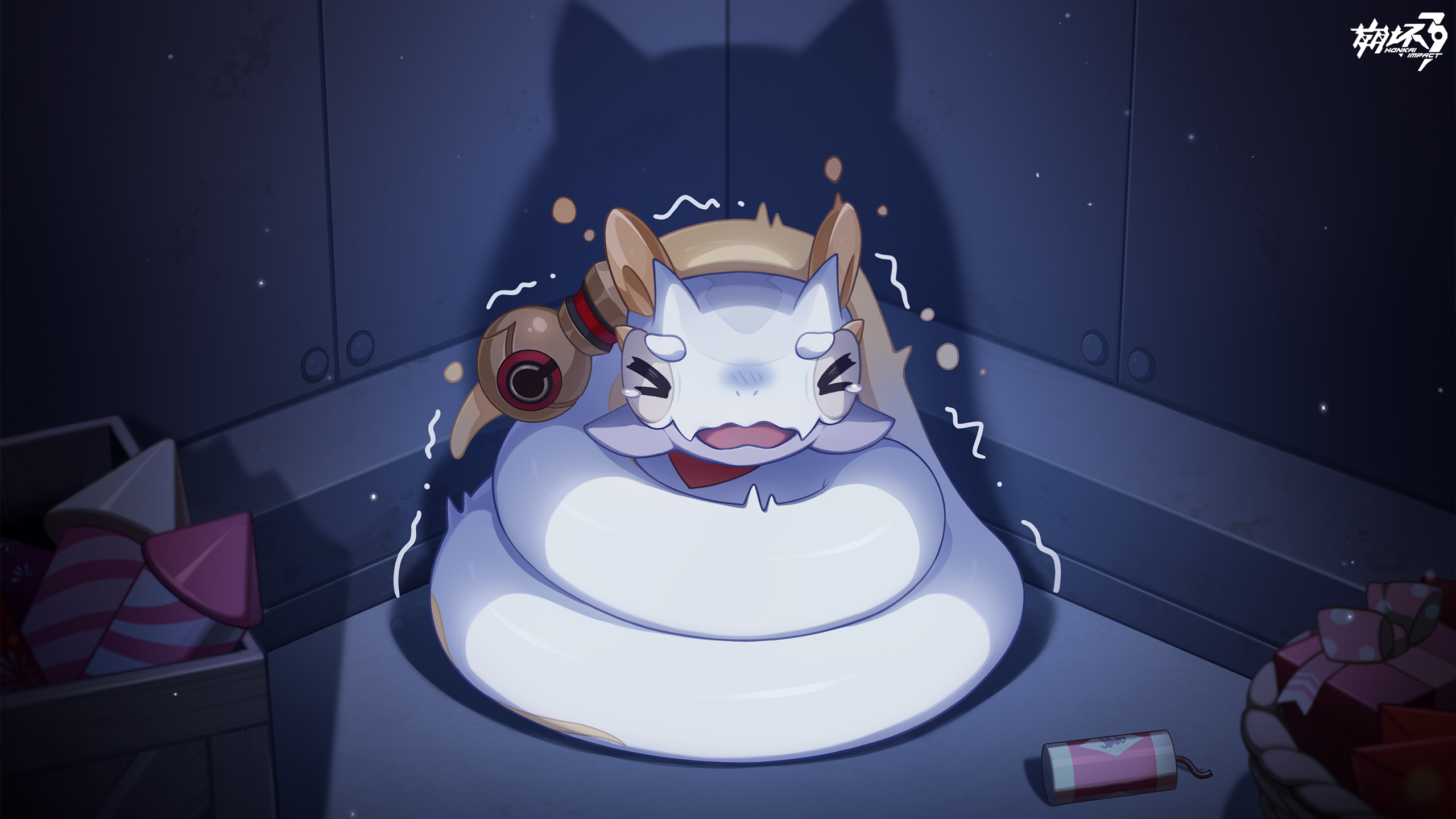 chinese_commentary commentary_request copyright_logo fireworks game_cg highres honkai_(series) honkai_impact_3rd logo no_humans official_art rice_cake_(honkai_impact) snake trembling