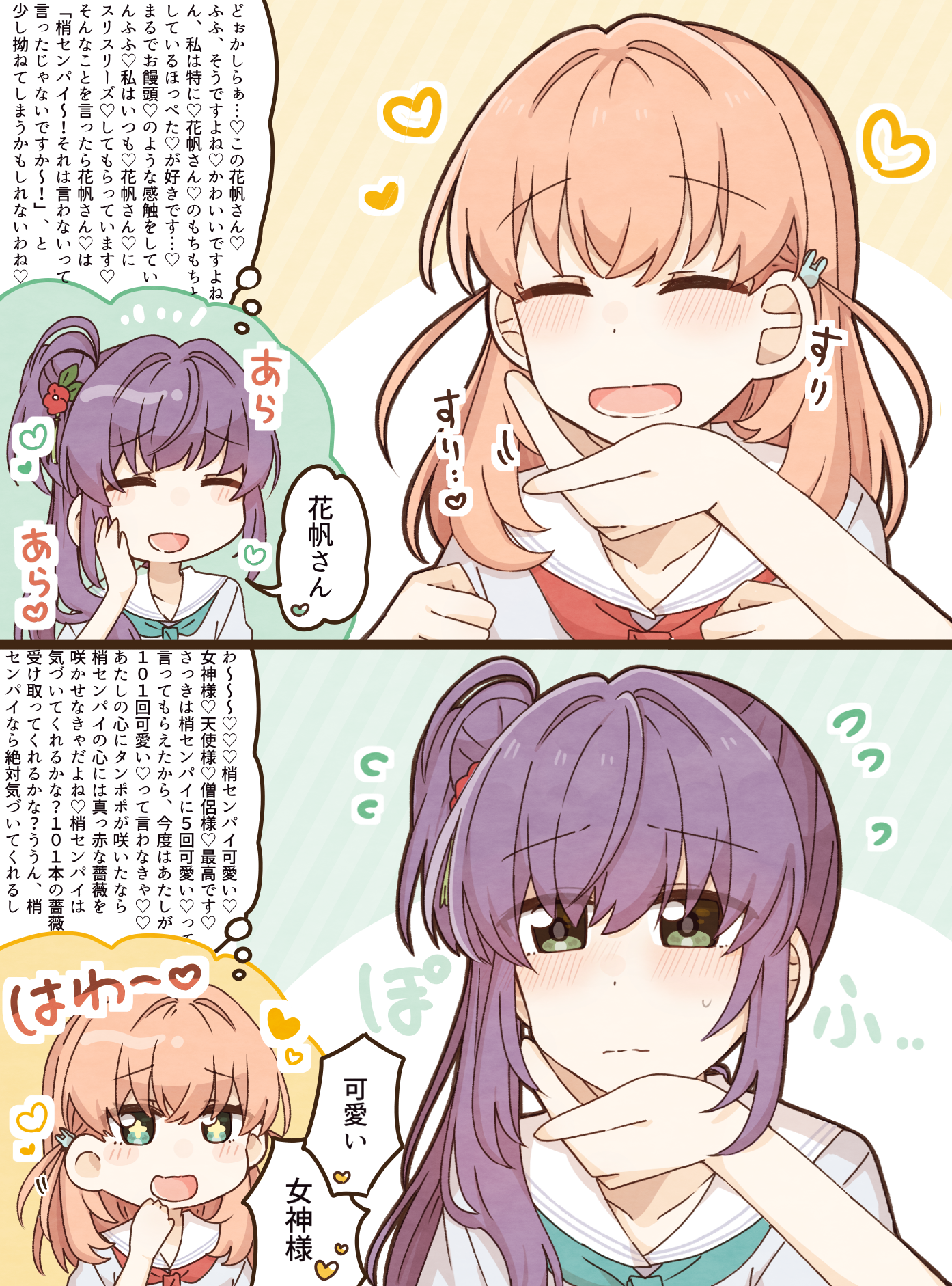 +_+ 2girls :d aqua_neckerchief cerise_bouquet chin_on_palm_challenge collarbone commentary_request crossed_bangs dress flower flying_sweatdrops hair_bun hair_flower hair_intakes hair_ornament hand_on_another's_chin hasu_no_sora_school_uniform heart highres hinoshita_kaho kurotoia link!_like!_love_live! long_hair long_sleeves love_live! medium_hair multiple_girls neckerchief open_mouth orange_hair otomune_kozue rabbit_hair_ornament raised_inner_eyebrows red_flower red_neckerchief sailor_collar sailor_dress school_uniform side_ponytail sidelocks single_side_bun smile speech_bubble spoken_heart summer_uniform tassel tassel_hair_ornament thought_bubble translation_request two_side_up virtual_youtuber white_sailor_collar yuri