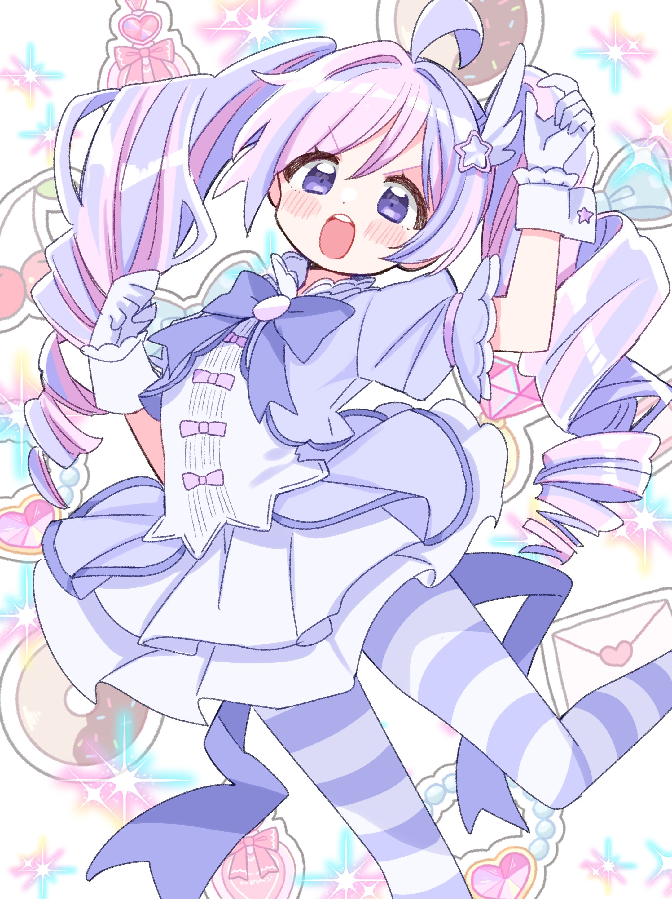 1girl absurdres ahoge blue_archive blush bow bowtie commentary_request donut dress drill_hair envelope food gloves hair_intakes hair_ornament highres long_hair looking_at_viewer multicolored_hair multicolored_thighhighs open_mouth pink_hair purple_bow purple_bowtie purple_dress purple_eyes purple_hair purple_shirt purple_thighhighs reisa_(blue_archive) reisa_(magical)_(blue_archive) shirt short_sleeves solo sparkle star_(symbol) star_hair_ornament striped_clothes striped_thighhighs sukoyaka_(100hituzi) teeth thighhighs thighs twin_drills two-tone_hair two-tone_thighhighs upper_teeth_only v-shaped_eyebrows white_background white_gloves white_wrist_cuffs wing_hair_ornament wrist_cuffs