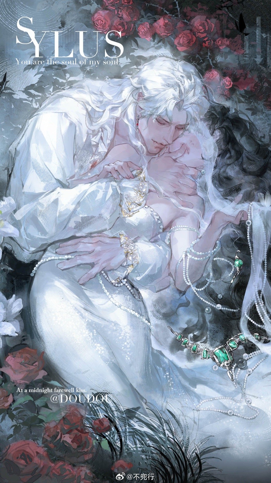 1boy 1girl 3fyl4pd28h0vmbe bare_shoulders chinese_commentary closed_eyes commentary_request dress earrings faceless faceless_female finger_to_mouth floral_background highres jewelry long_hair long_sleeves love_and_deepspace monochrome nose official_alternate_hair_length official_alternate_hairstyle parted_bangs parted_lips protagonist_(love_and_deepspace) puffy_long_sleeves puffy_sleeves shirt sylus_(love_and_deepspace) vampire white_dress white_hair white_shirt