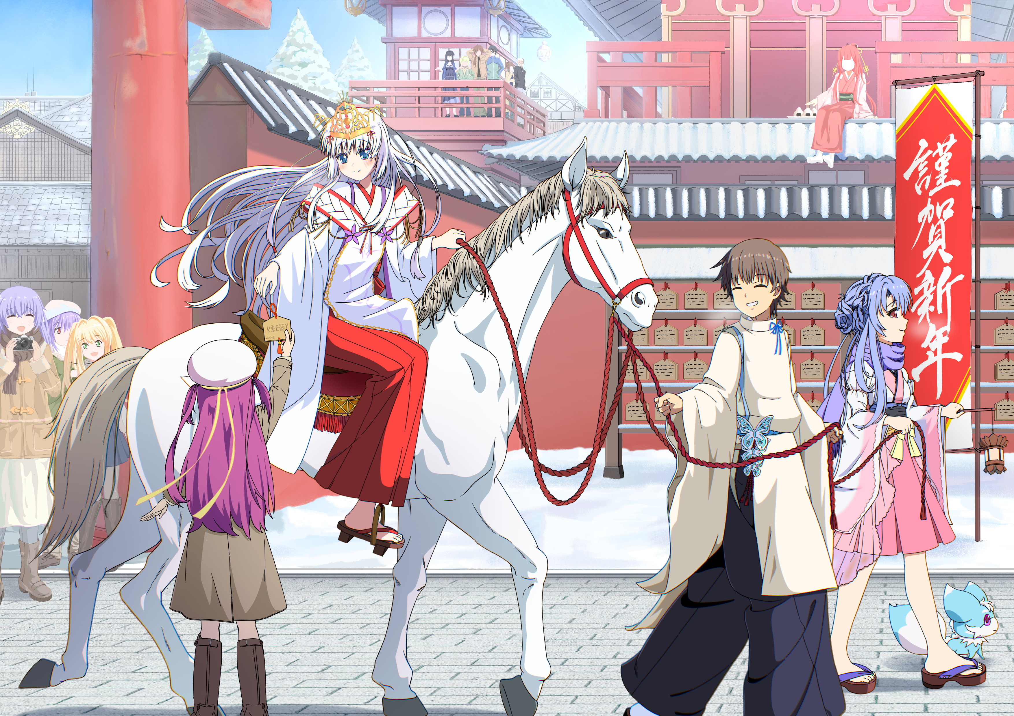 4boys 6+girls :d ^_^ absurdres alternate_costume black_hair black_hakama blonde_hair blue_eyes blue_hair blue_sky boots braid brown_boots brown_hair camera chinese_zodiac closed_eyes closed_mouth commentary_request crown_braid day ema everyone floating_hair food fox from_side full_body gold_tiara green_eyes grin hair_bun hair_ornament hakama hat hat_ribbon highres holding holding_camera holding_ema holding_lantern holding_rope horse inari_(summer_pockets) japanese_clothes kamiyama_shiki kanou_tenzen katou_umi key_season kimono kushima_kamome lantern long_hair long_sleeves looking_at_another medium_skirt miko misaki_kyouko_(summer_pockets) mitani_ryouichi mizuori_shizuku multiple_boys multiple_girls naruse_kobato naruse_shiroha new_year no_socks nomura_miki nontraditional_miko official_alternate_costume onigiri open_mouth outdoors pink_hair pink_skirt pleated_skirt profile purple_hair purple_scarf red_eyes red_hair red_hakama red_kimono ribbon rope sailor_hat sandals scarf scenery short_hair shrine siblings single_hair_bun sisters sitting sitting_on_animal skirt sky smile snow sorakado_ai sorakado_ao standing straight_hair summer_pockets takahara_hairi tassel tassel_hair_ornament torii tsumugi_wenders twins twintails two_side_up very_long_hair walking white_hair white_hat white_horse white_kimono wide_sleeves wind winter winter_clothes year_of_the_horse yellow_ribbon