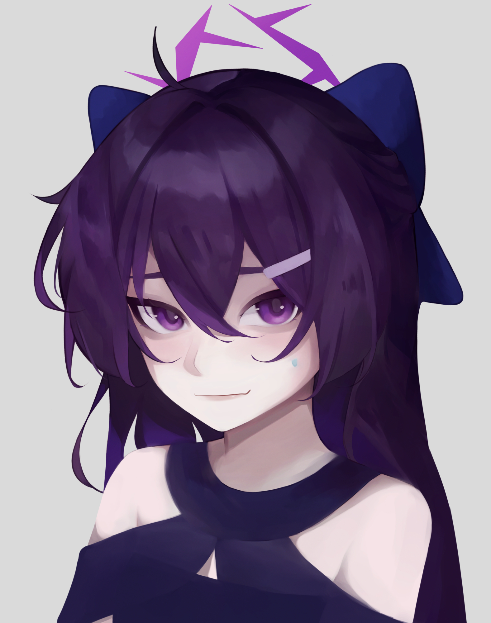 1girl ahoge bare_shoulders blue_archive blue_bow bow closed_mouth double-parted_bangs grey_background hair_between_eyes hair_bow hair_ornament hairpin halo haruka_(blue_archive) haruka_(dress)_(blue_archive) highres long_hair nervous_smile portrait purple_eyes purple_hair purple_halo simple_background smile solo sweatdrop tsurime verena_sui