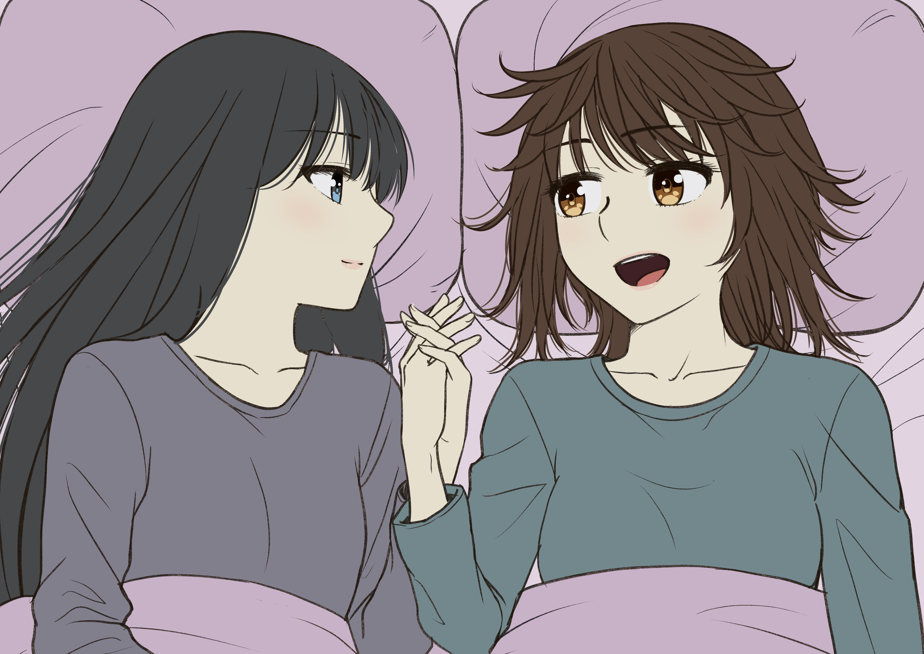 2girls absurdres black_hair blue_eyes brown_eyes brown_hair closed_mouth commentary_request from_above green_shirt grey_shirt highres holding_hands interlocked_fingers long_hair looking_at_another multiple_girls open_mouth original pillow ryuusa shirt smile under_covers yuri