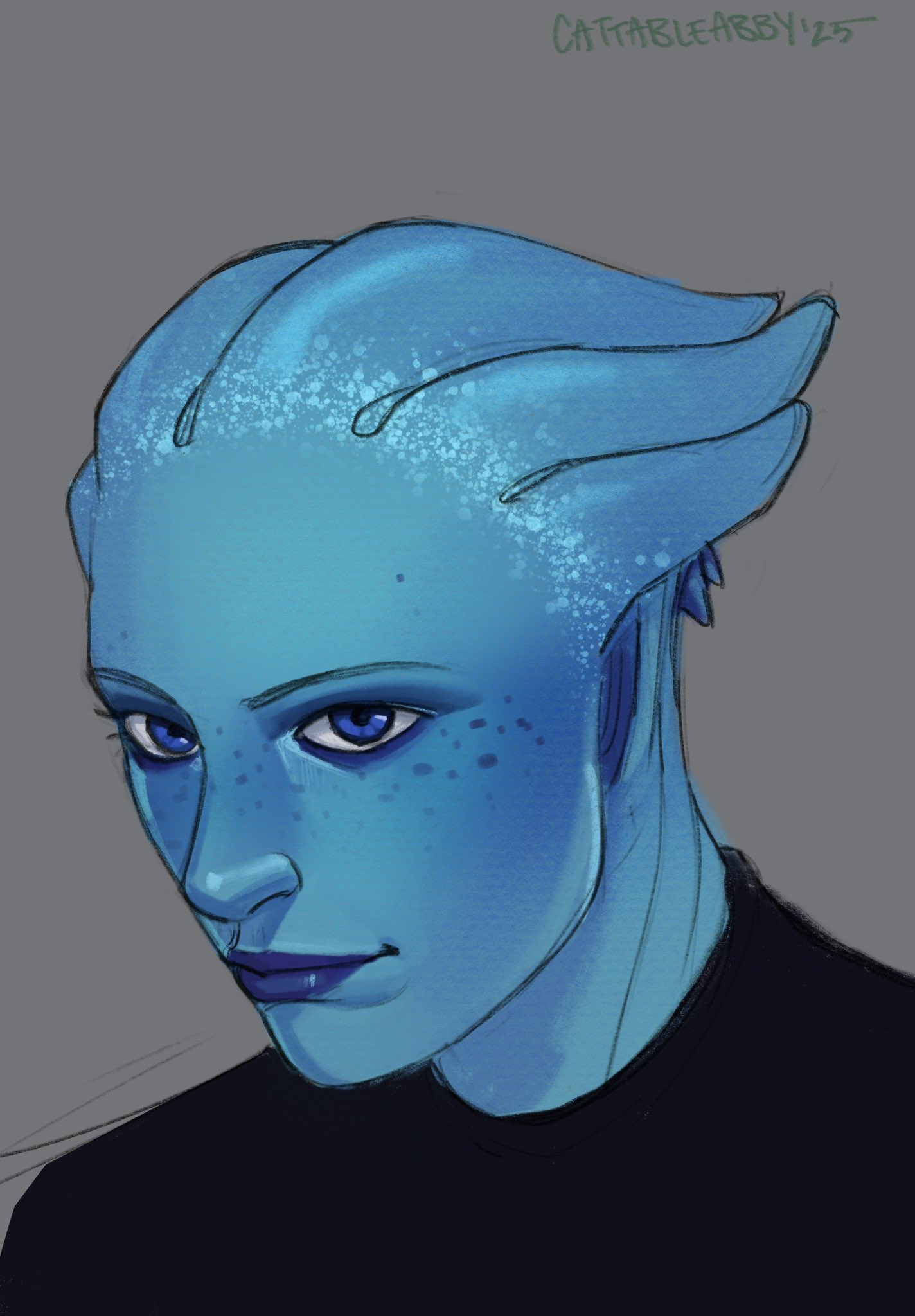 1girl alien artist_name asari_(mass_effect) black_shirt blue_eyes blue_skin cattableabby colored_skin grey_background highres liara_t'soni mass_effect_(series) portrait shirt simple_background solo